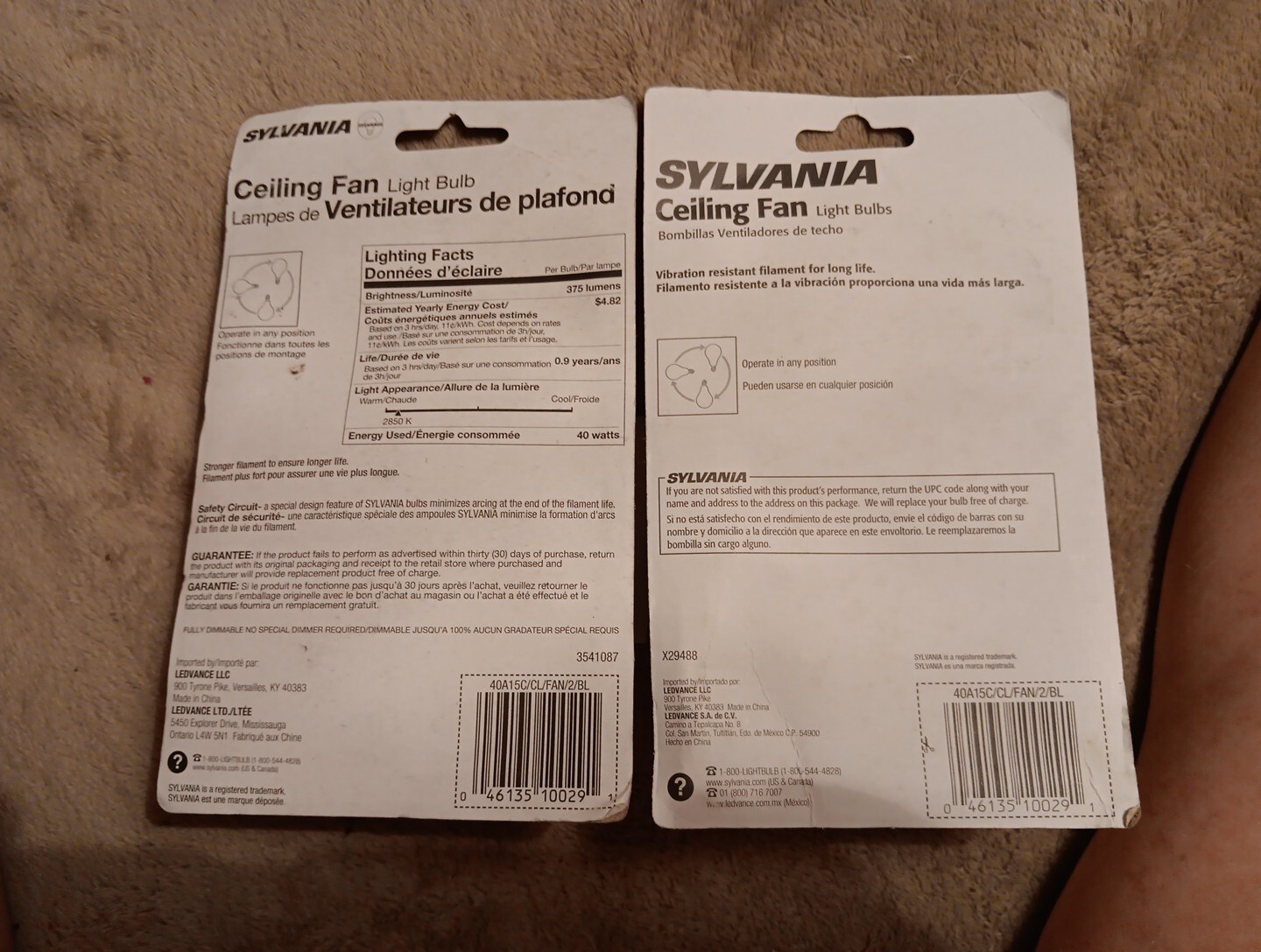 4 Sylvania 40W Candelabra Base Ceiling Fan Bulbs, Diff Package, Same Bulb