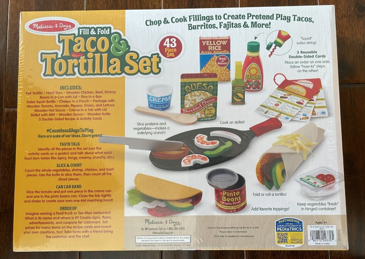 NEW Melissa Doug 43-Piece Fill Fold Taco Tortilla SALSA PRETEND PLAY Set