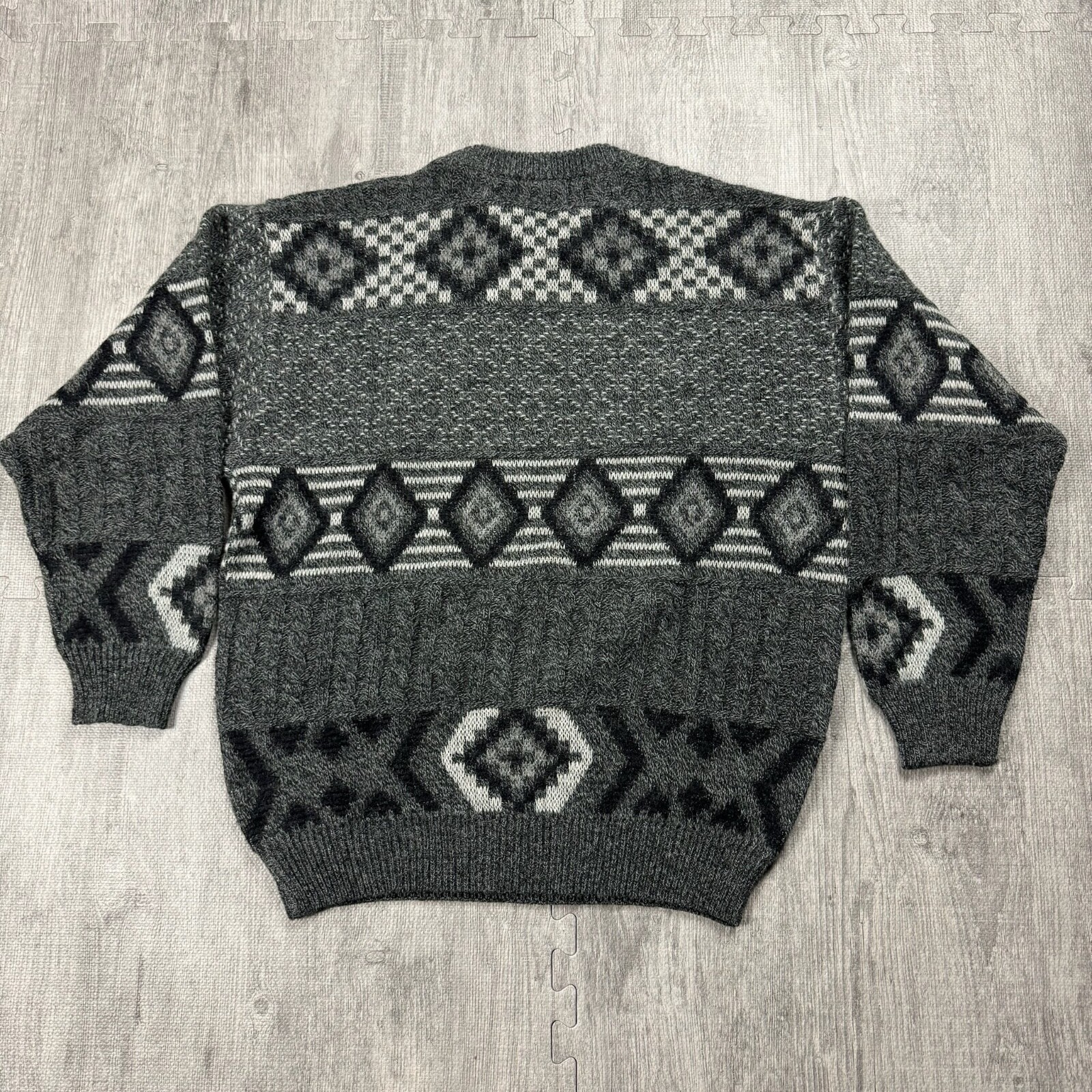 VTG 90S MENS ABSTRACT GEOMETRIC GRANDPA SWEATER GREY BLACK PULLOVER SIZE XL