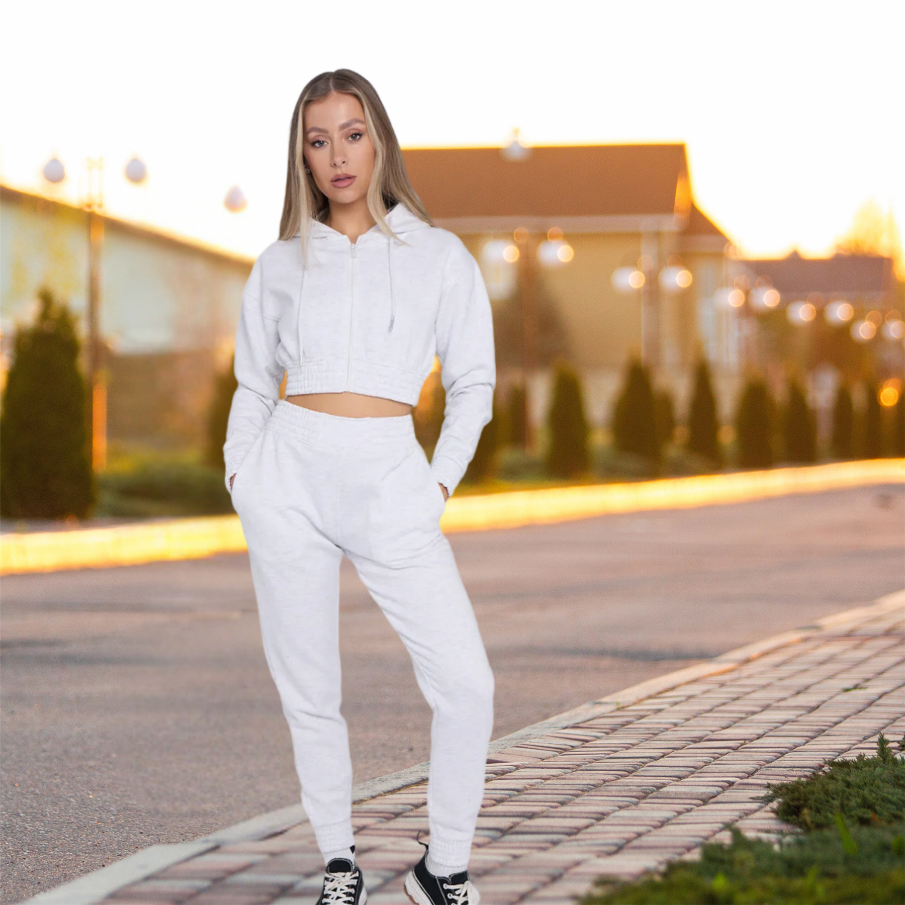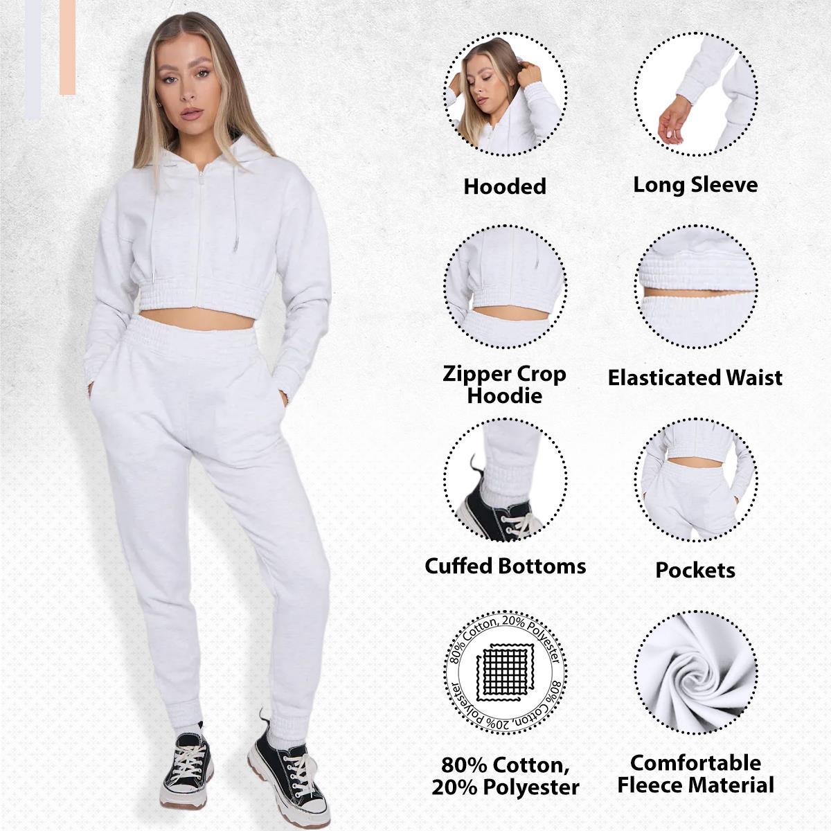 Womens Hooded Tracksuit Fleece Cropped Zipper Hoodie Cuffed Joggers 2 Pcs Co-ord