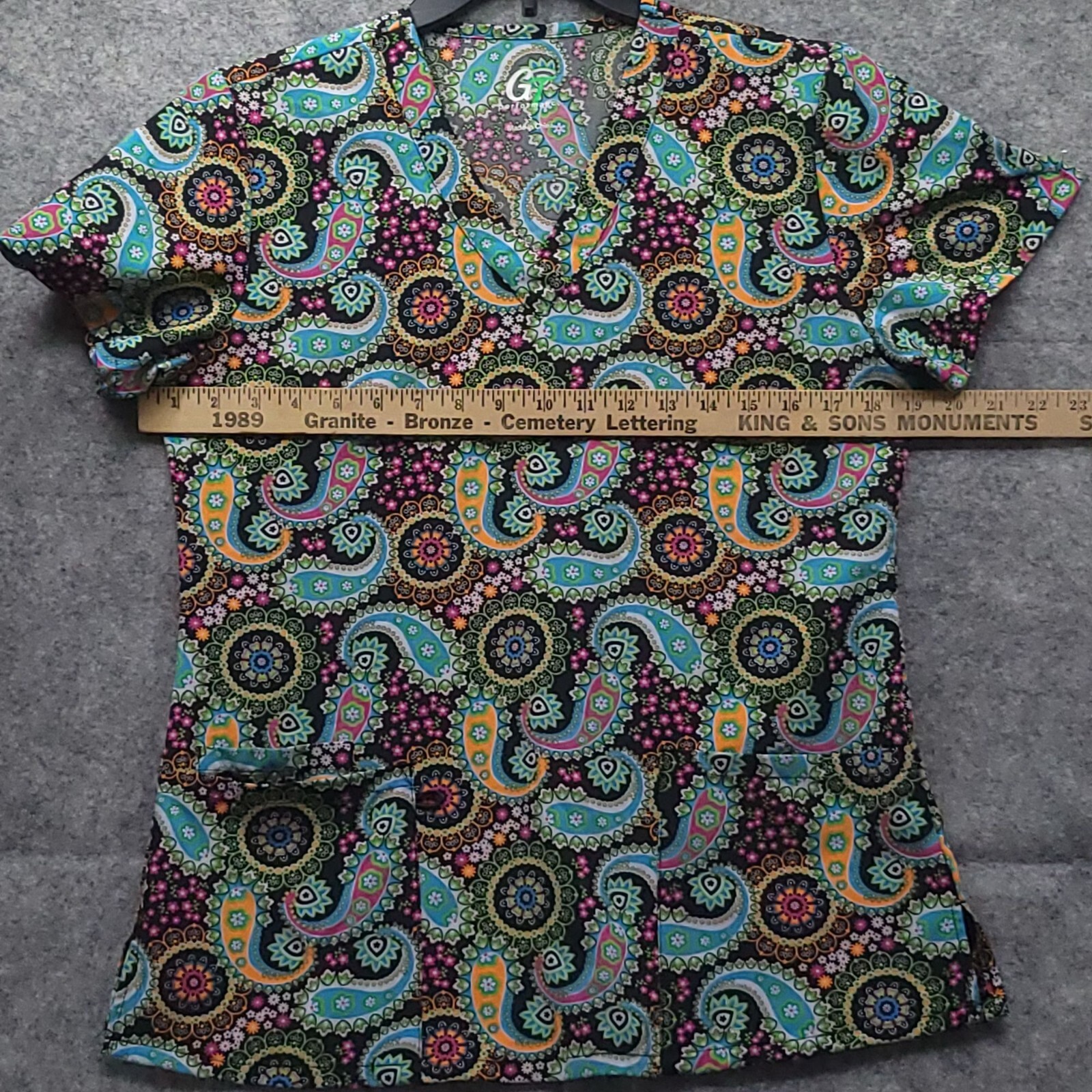 как выглядит GT Performance Womens Ethnic Paisley Scrub Top Sz S Multi Short Sleeves Pockets фото