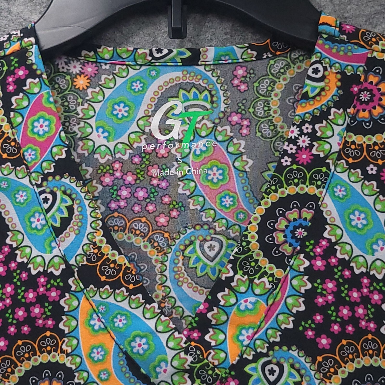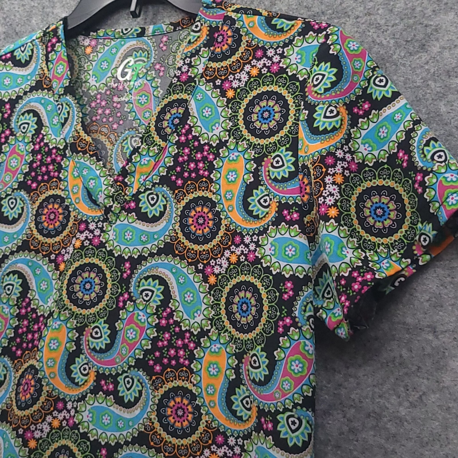 GT Performance Womens Ethnic Paisley Scrub Top Sz S Multi Short Sleeves Pockets