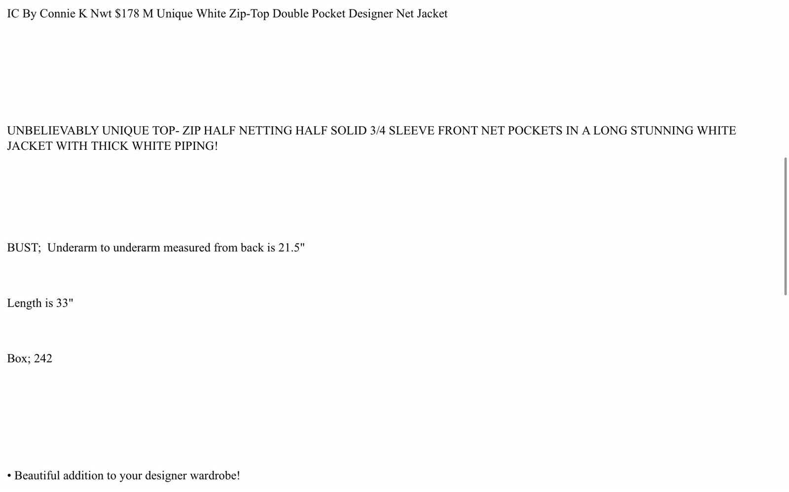 IC by Connie K 178 M NWT White Mesh on Hem/Pockets/Cuffs CRUISE BEACHWEAR - WOW