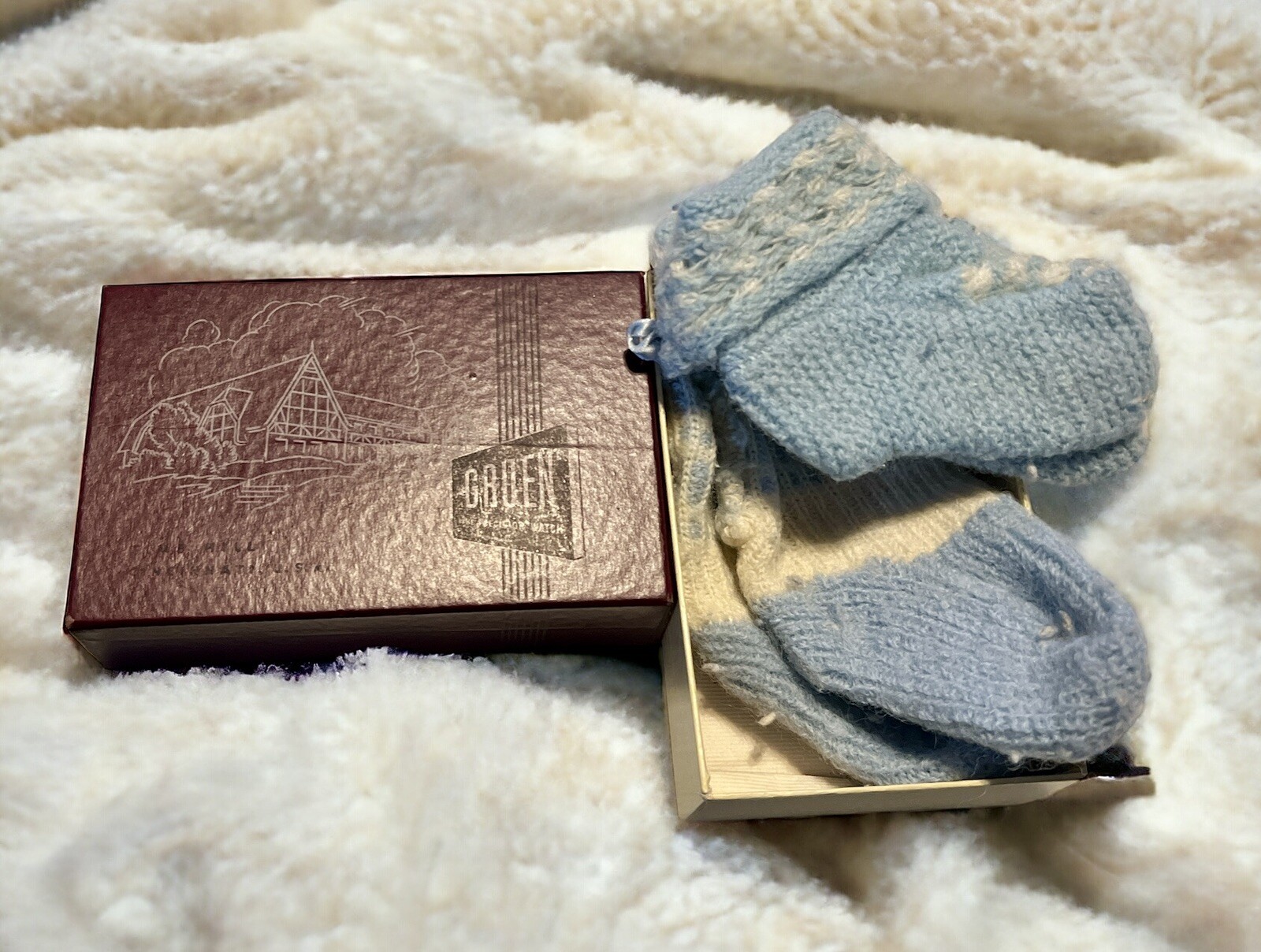 Vintage 2 Pairs Hand Knit White Blue Baby Booties In VTG Gruen Box 3 X5