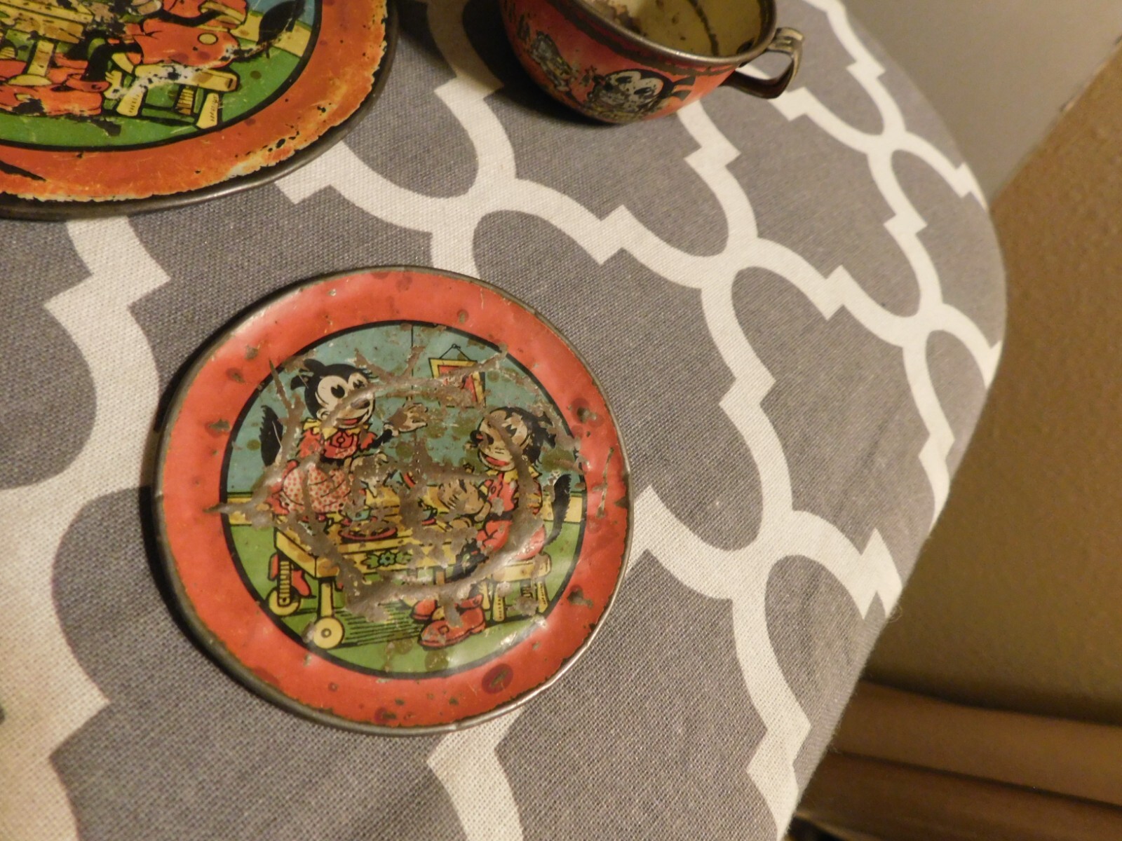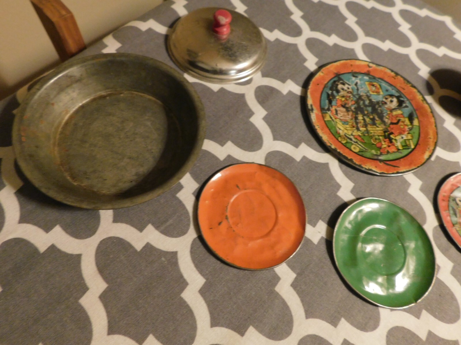 Metal Doll Dish Lot Vintage Mouse Pie Tin Pot Lid