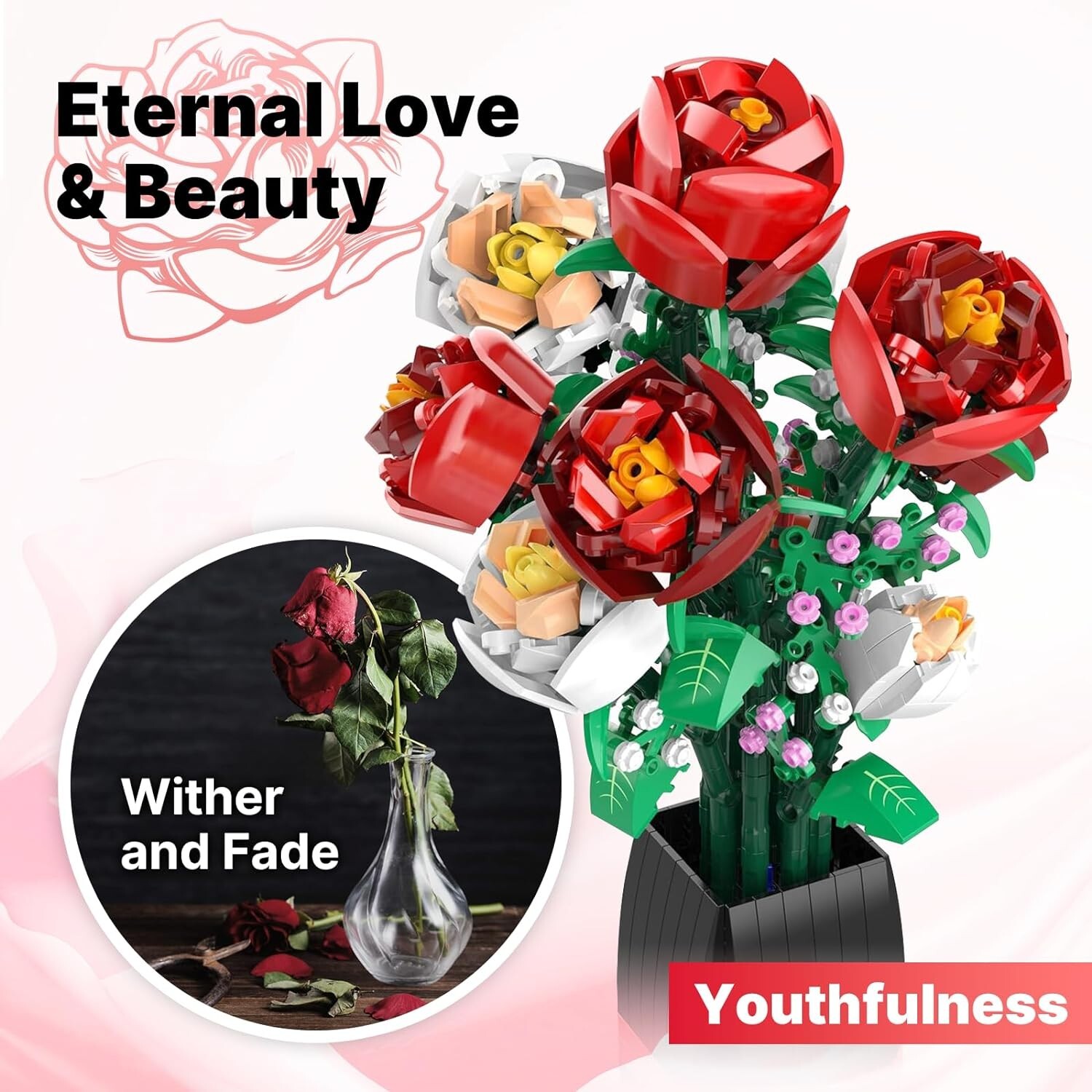как выглядит 818 Pcs Rose Flower Bouquet Building Set with Vase,Artificial Flowers Blocks Set фото