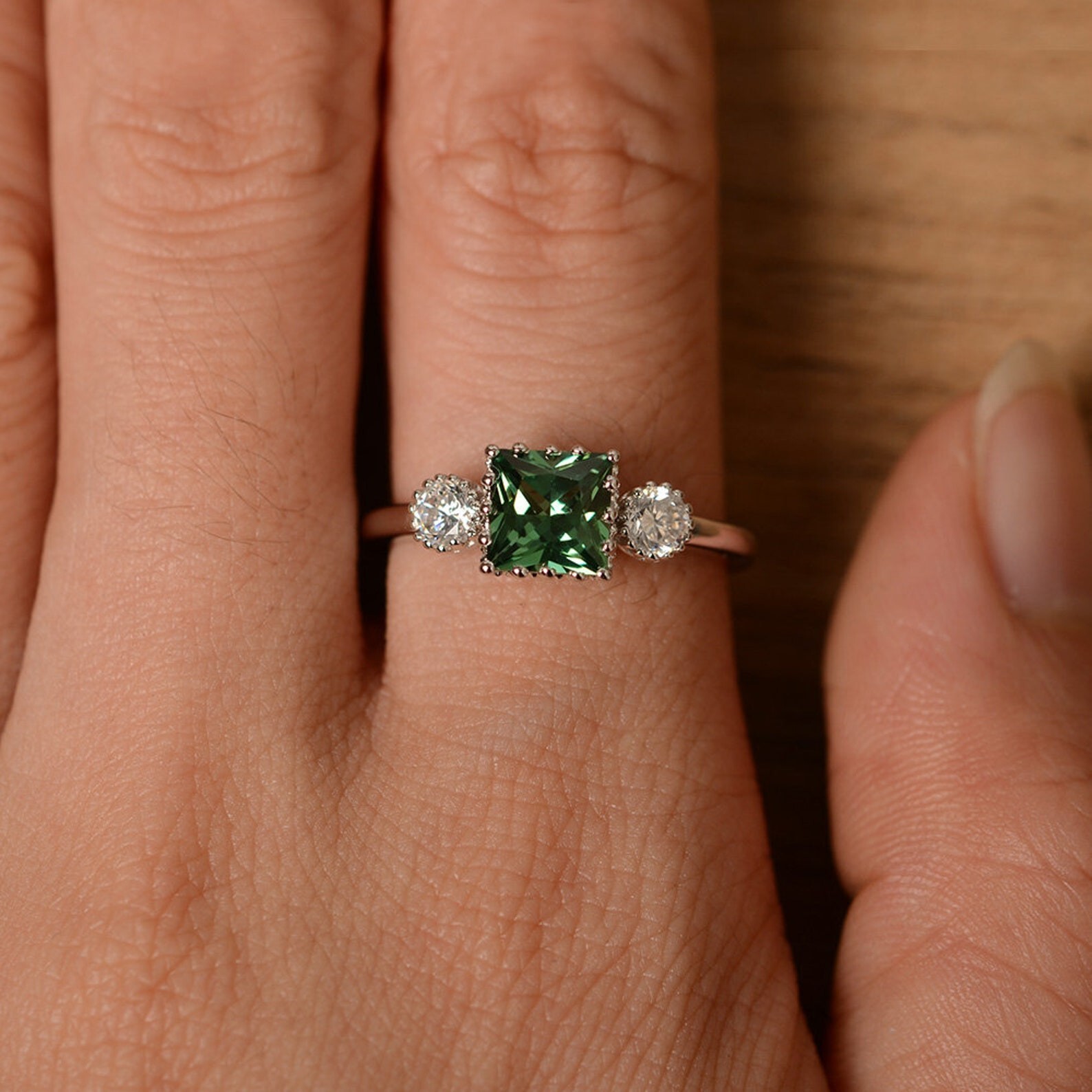 как выглядит green sapphire ring princess cut green stone 925 silver anniversary ring фото