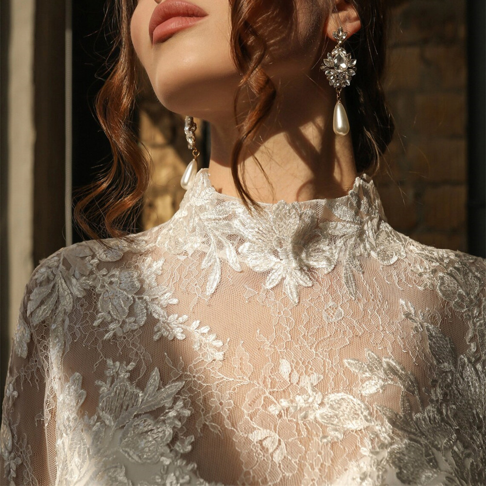 Elegant High Neck Long Sleeve Lace Applique Buttons Back Mermaid Wedding Dresses