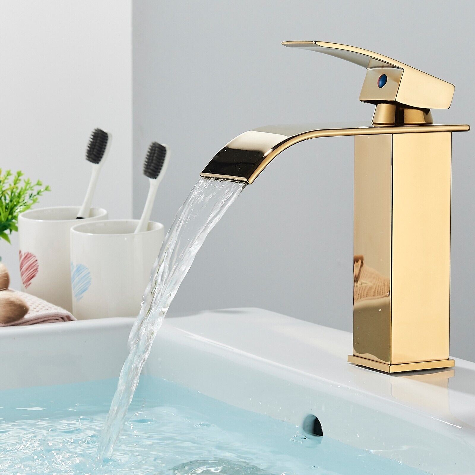 Brushed Gold Single Handle Bathroom Sink Faucet Waterfall Vanity Mixer w/Drain