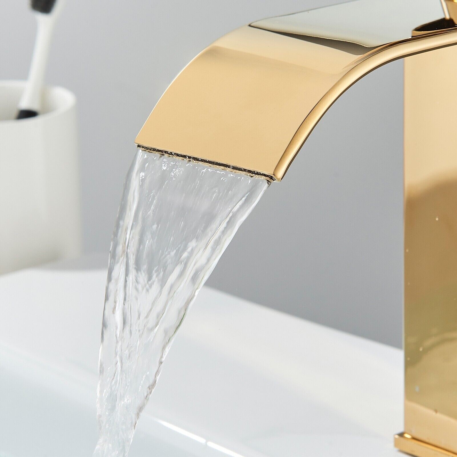 как выглядит Brushed Gold Single Handle Bathroom Sink Faucet Waterfall Vanity Mixer w/Drain фото