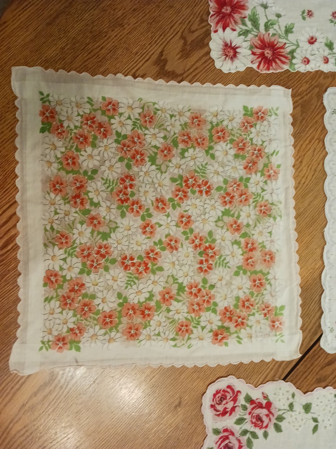 как выглядит 4 Vintage Hankies. Classic Floral Designs. Scalloped Edges. Very Nice. фото