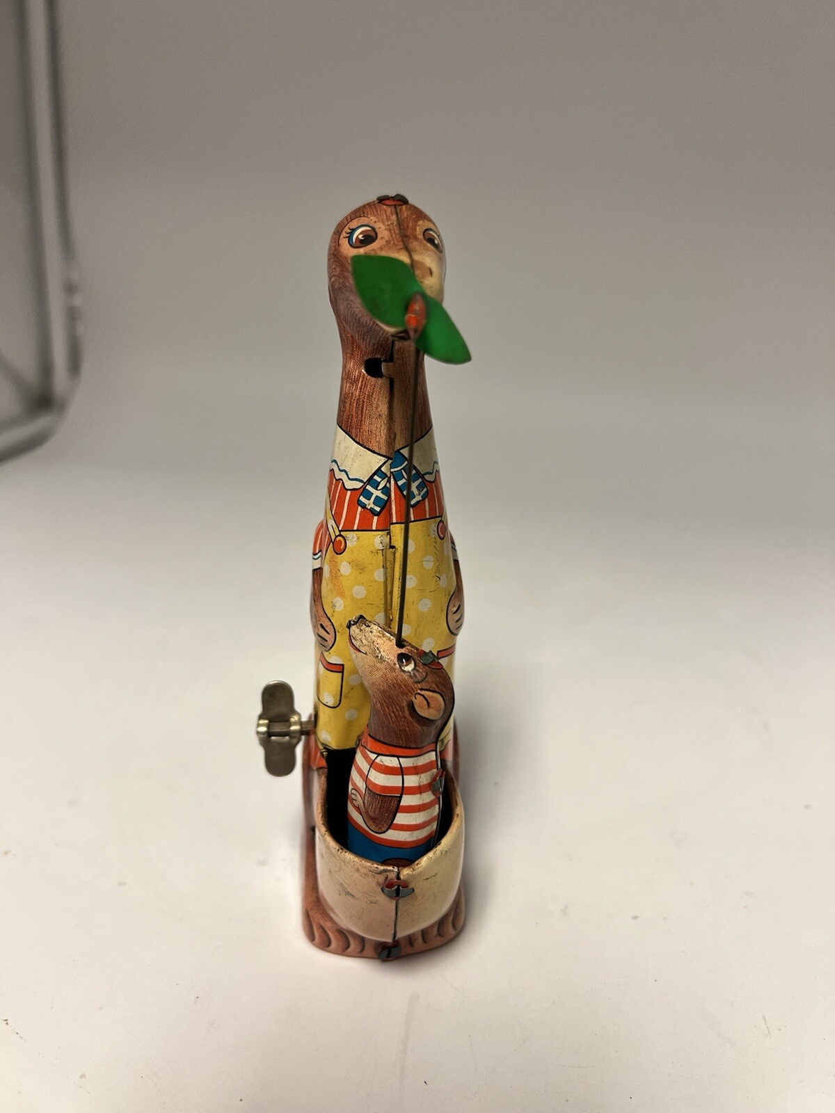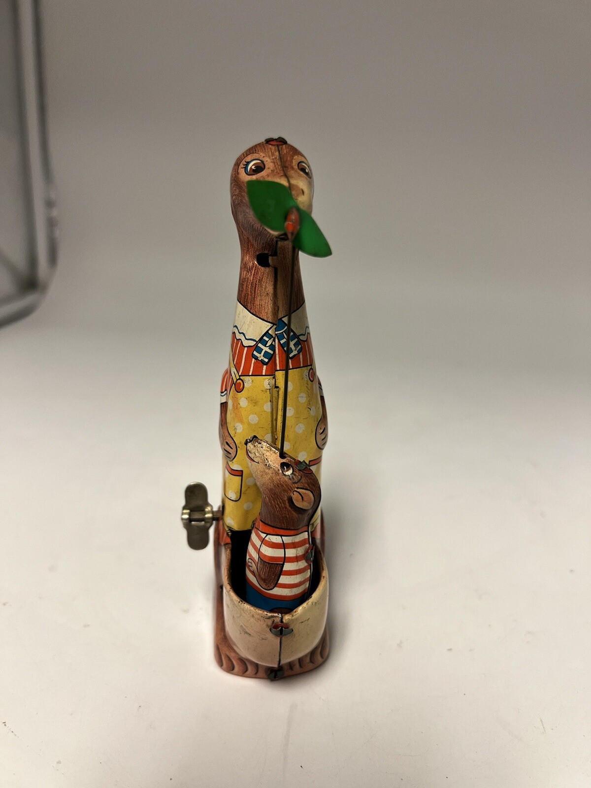 Vintage Tin MAMA Kangaroo With Playful Baby Wind Up Toy Works Great.