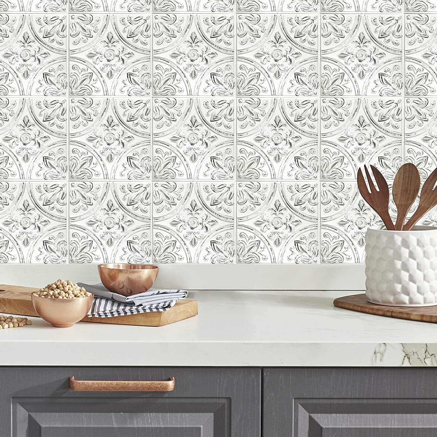 Roommates TIL4623FLT Sticktiles White Tin Peel and Stick Tile Backsplash, 10.5 I