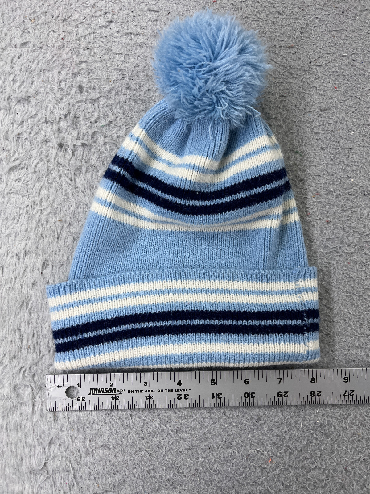 Beanie Toque Youth One Size Blue White Stripe Knit Acrylic Blend Outdoor Ski Pom
