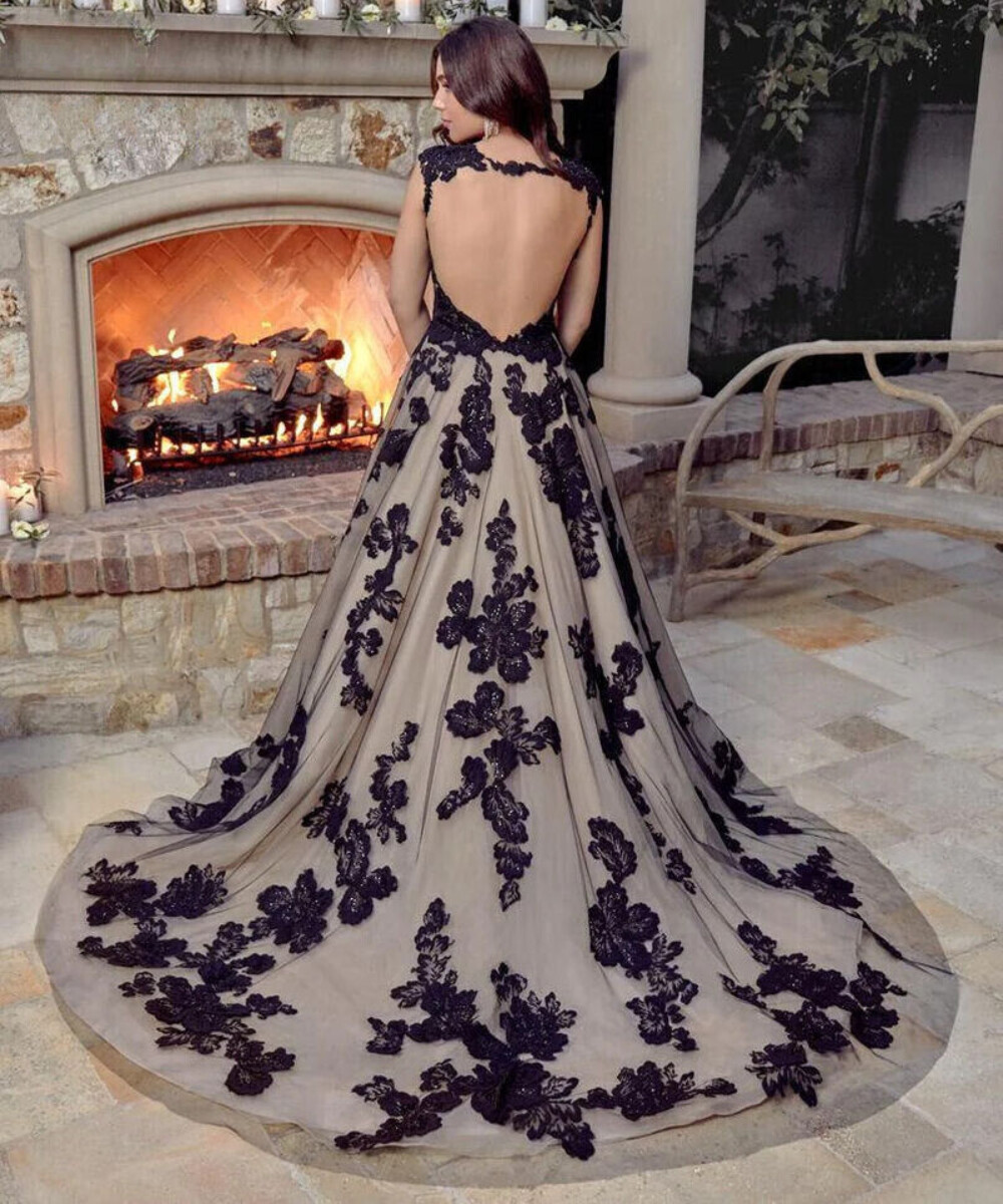 как выглядит Black Tulle Wedding Dress Scoop Neck Cap Sleeves Appliques Backless Bridal Gown фото