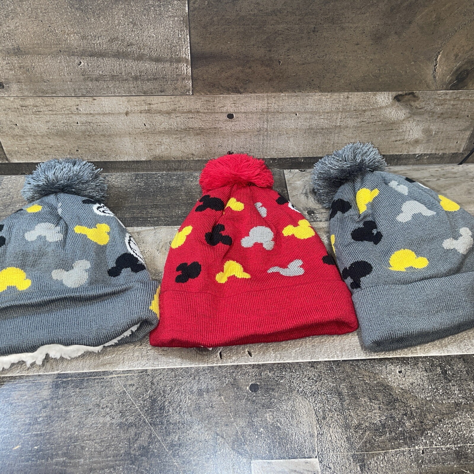 • Lot of 3 Mickey Mouse Youth Beanies Red and Gray Pom Cold Weather Ready