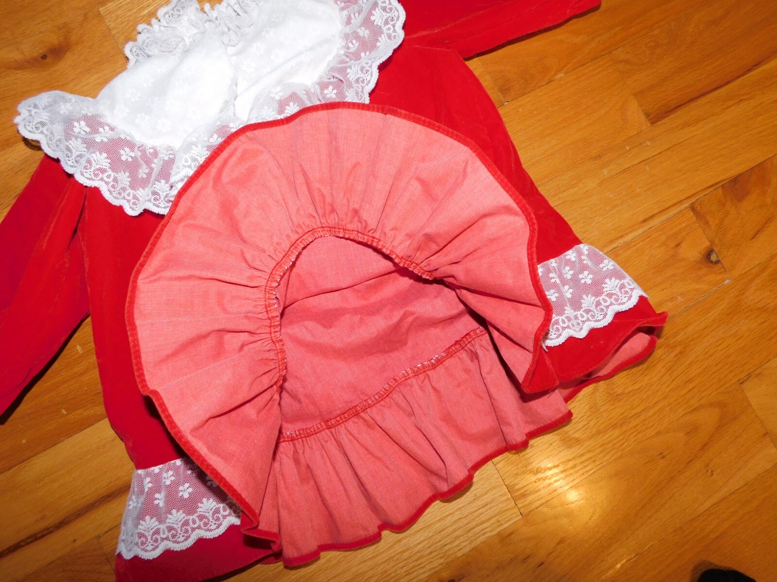 как выглядит Full Circle Red Velvet Toddler Party Dress w/ Lacy Ruffles Vintage USA TLC фото