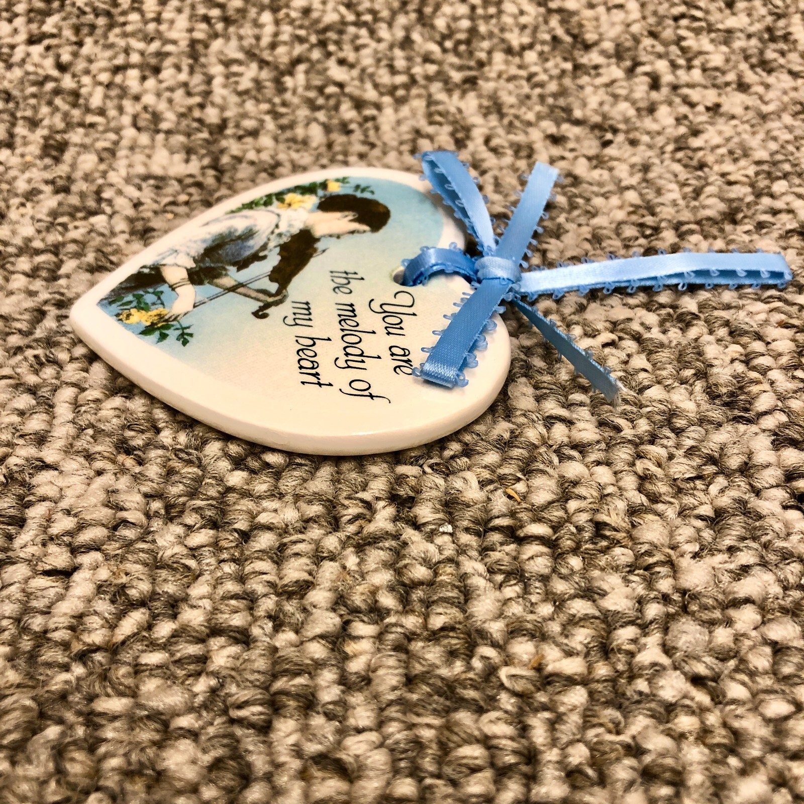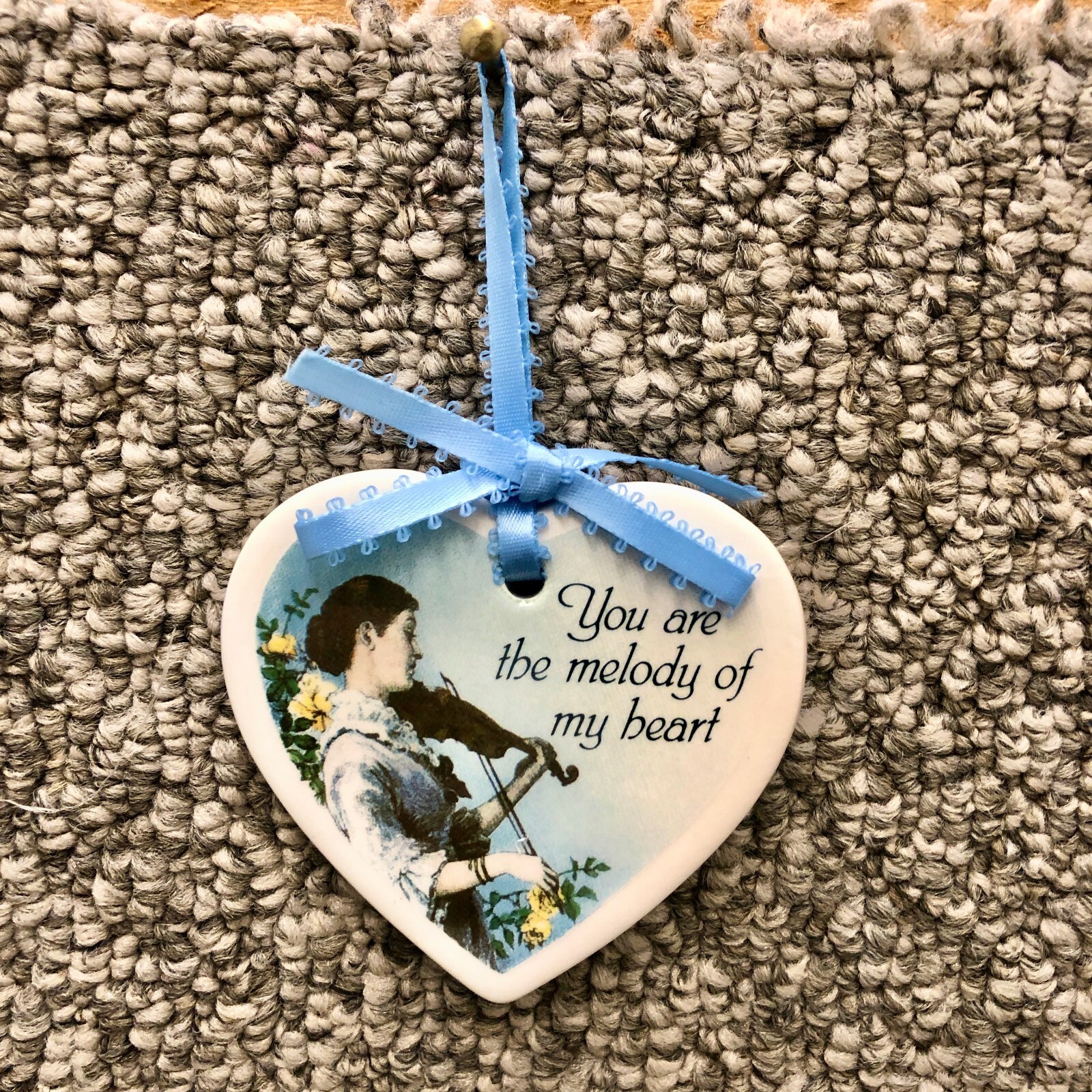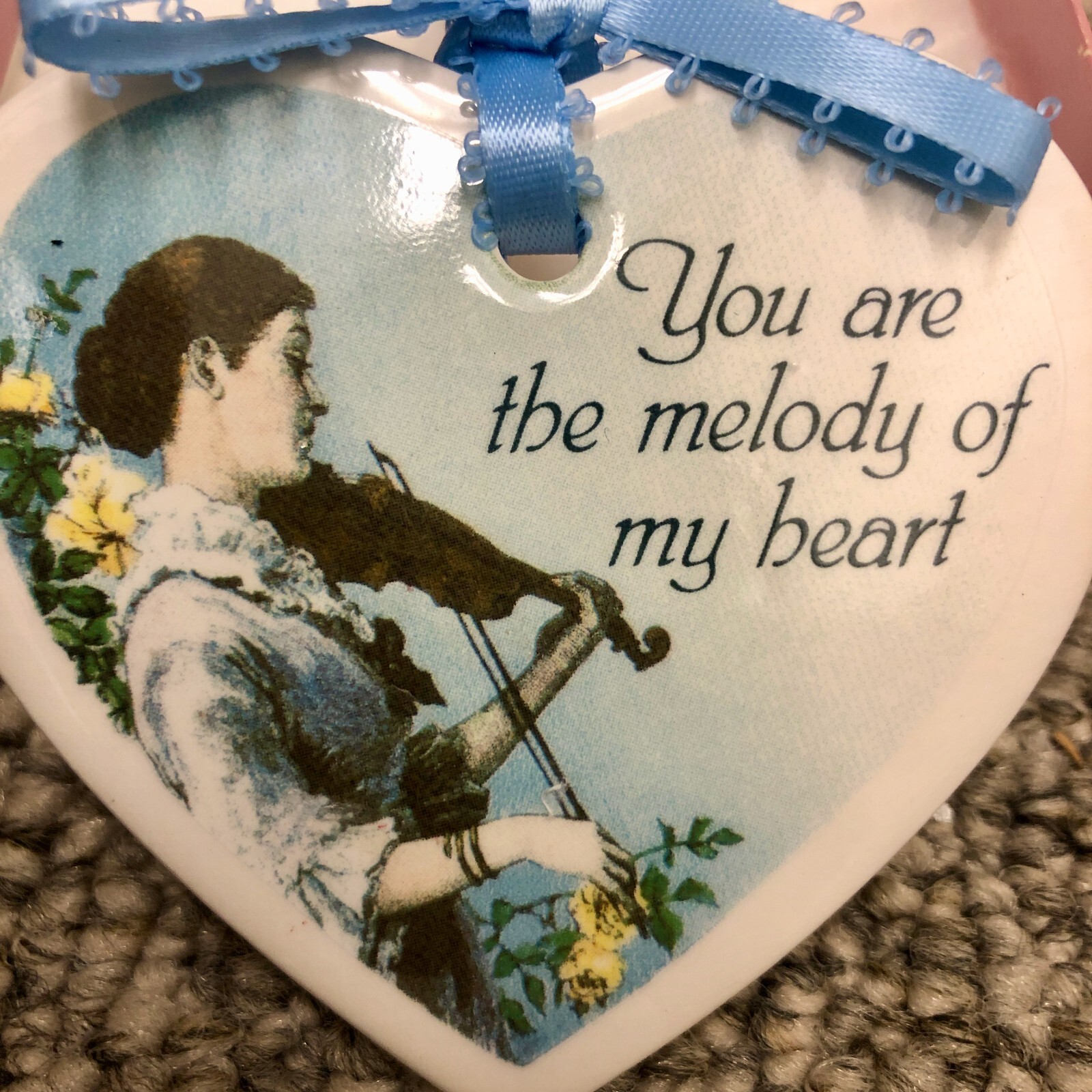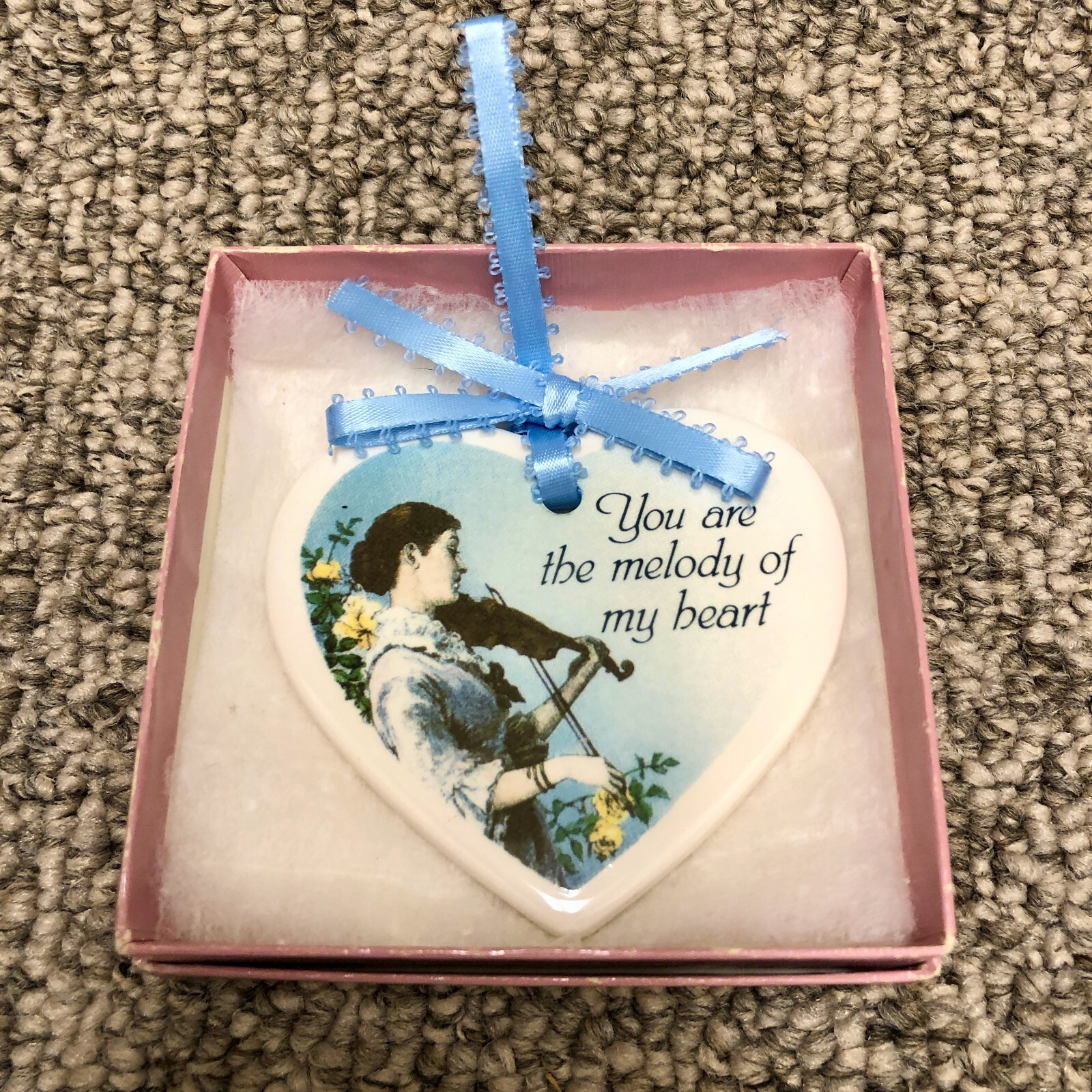 Heart Shaped Ceramic Xmas Violinist Musician Melody Ornament Blue Ribbon