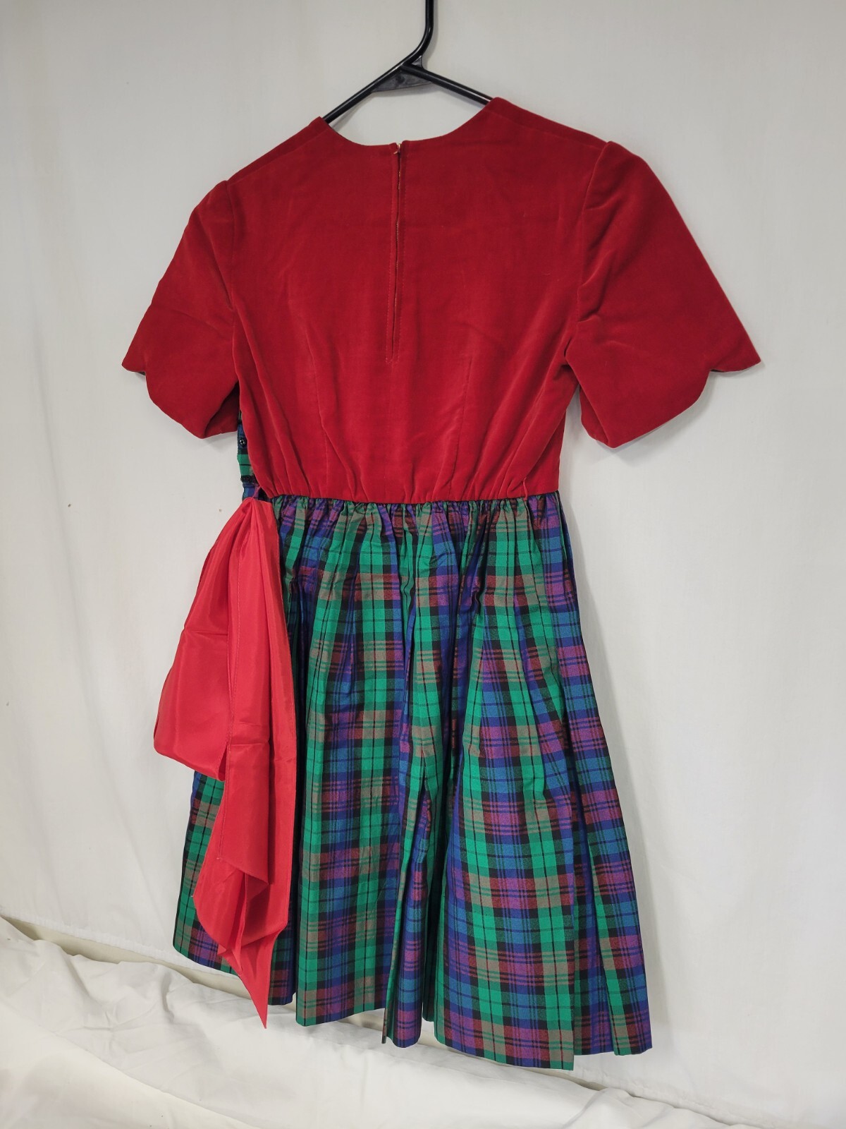 Vintage Girls Plaid Velvet Holiday Christmas Dress Red Waist Wrap