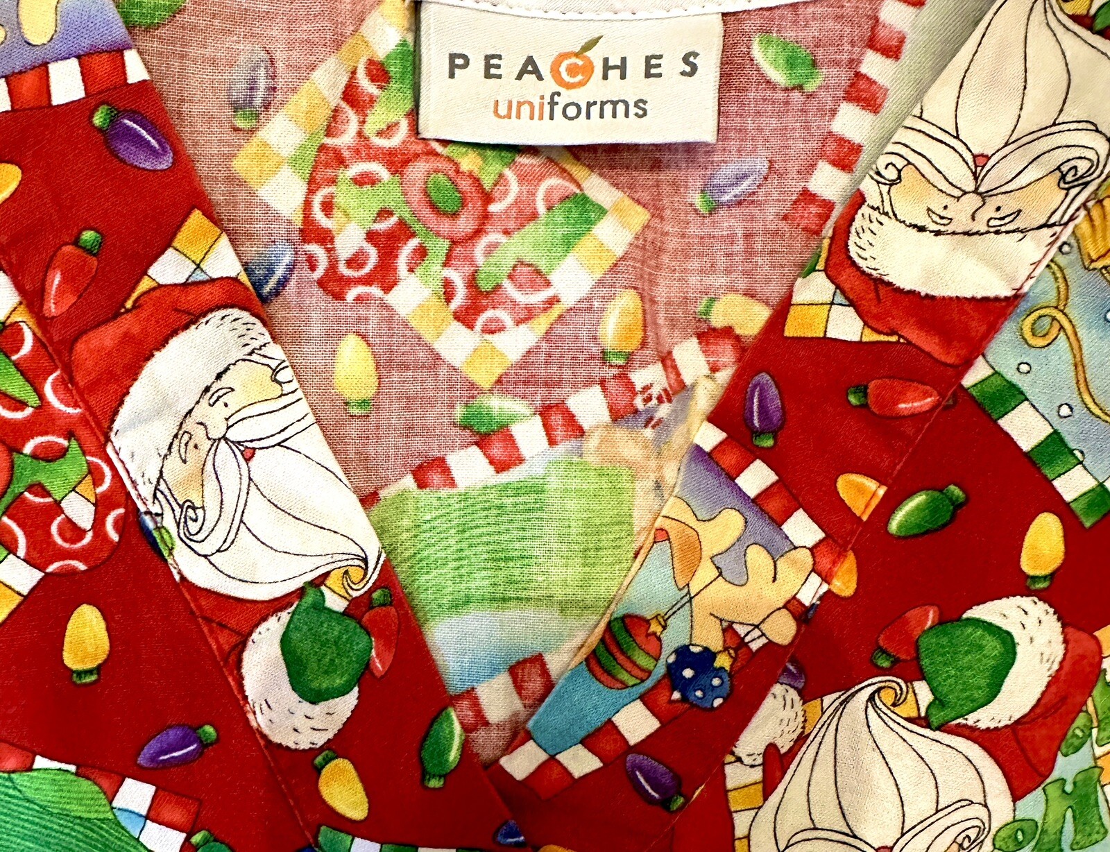 Peaches Women s Holiday Christmas Pattern Scrub Top Size Medium Red