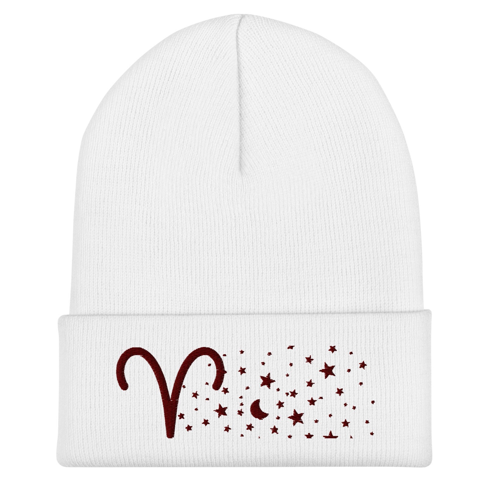 Aries Ram in the Stars Knit Beanie - Cozy Knit Hat Red Thread White