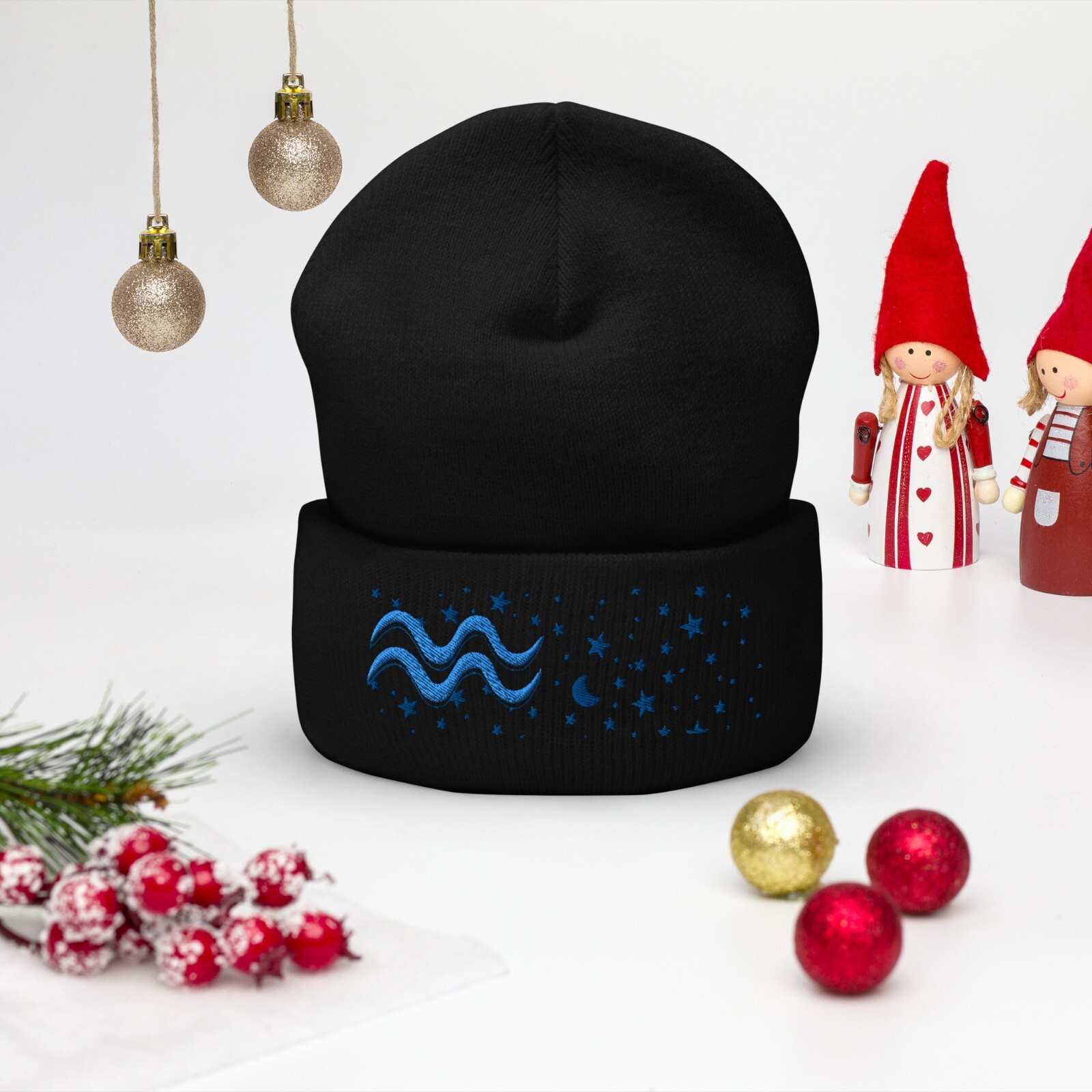 Aquarius in the Stars Knit Beanie - Cozy Knit Hat Black