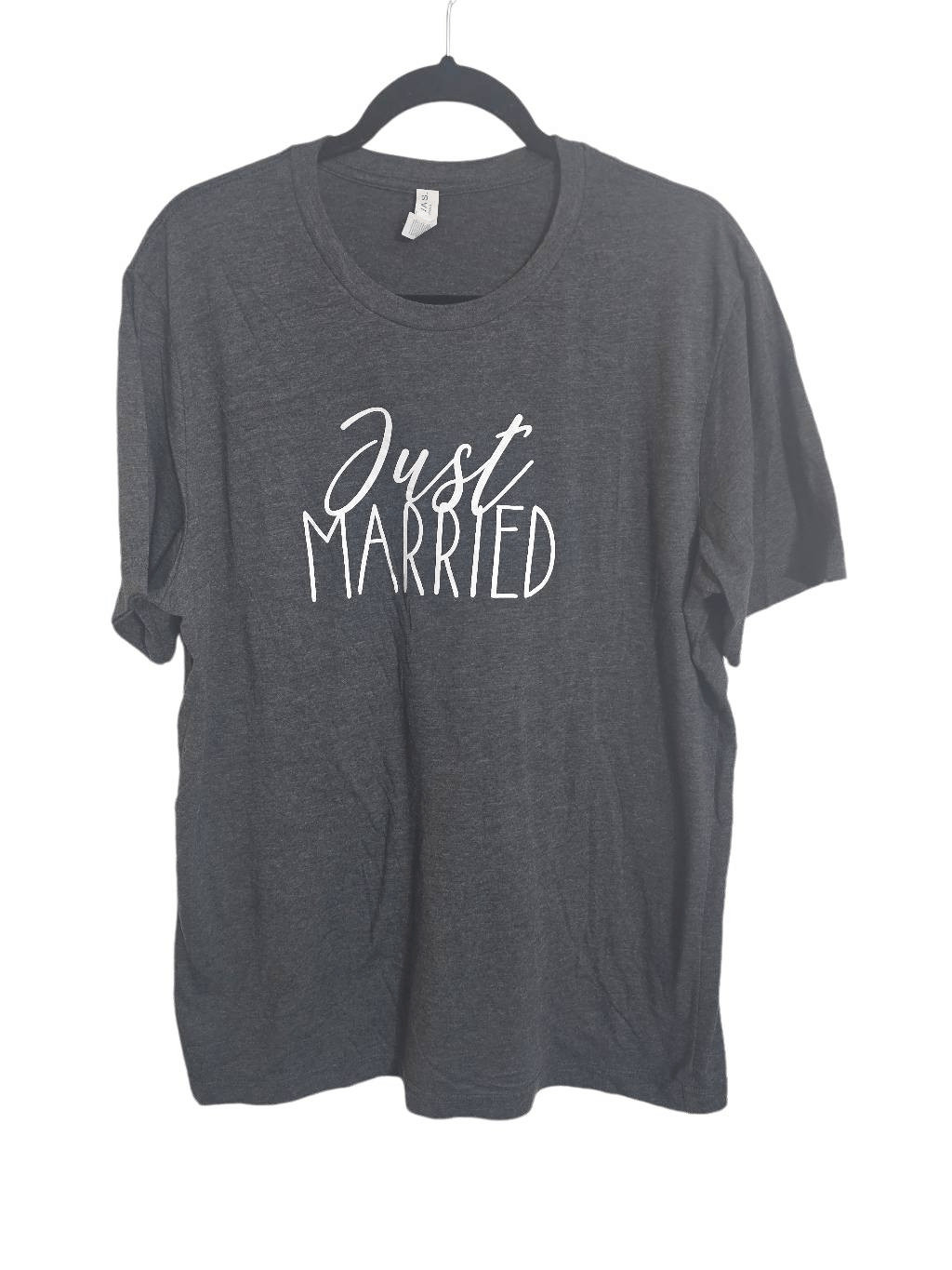 JUST MARRIED SET of TEE'S Mens XL and Women's Vneck Tee XL Grey White Canvas Bel