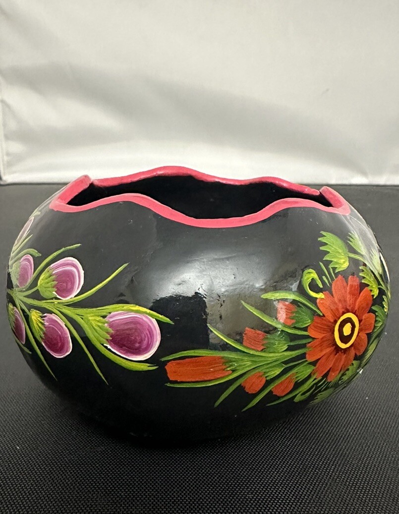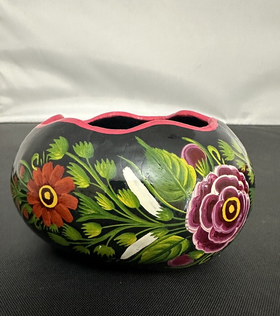 Folk Art Gourd Bowl Hand Painted 4 Trinket Floral Magenta Scallop Design
