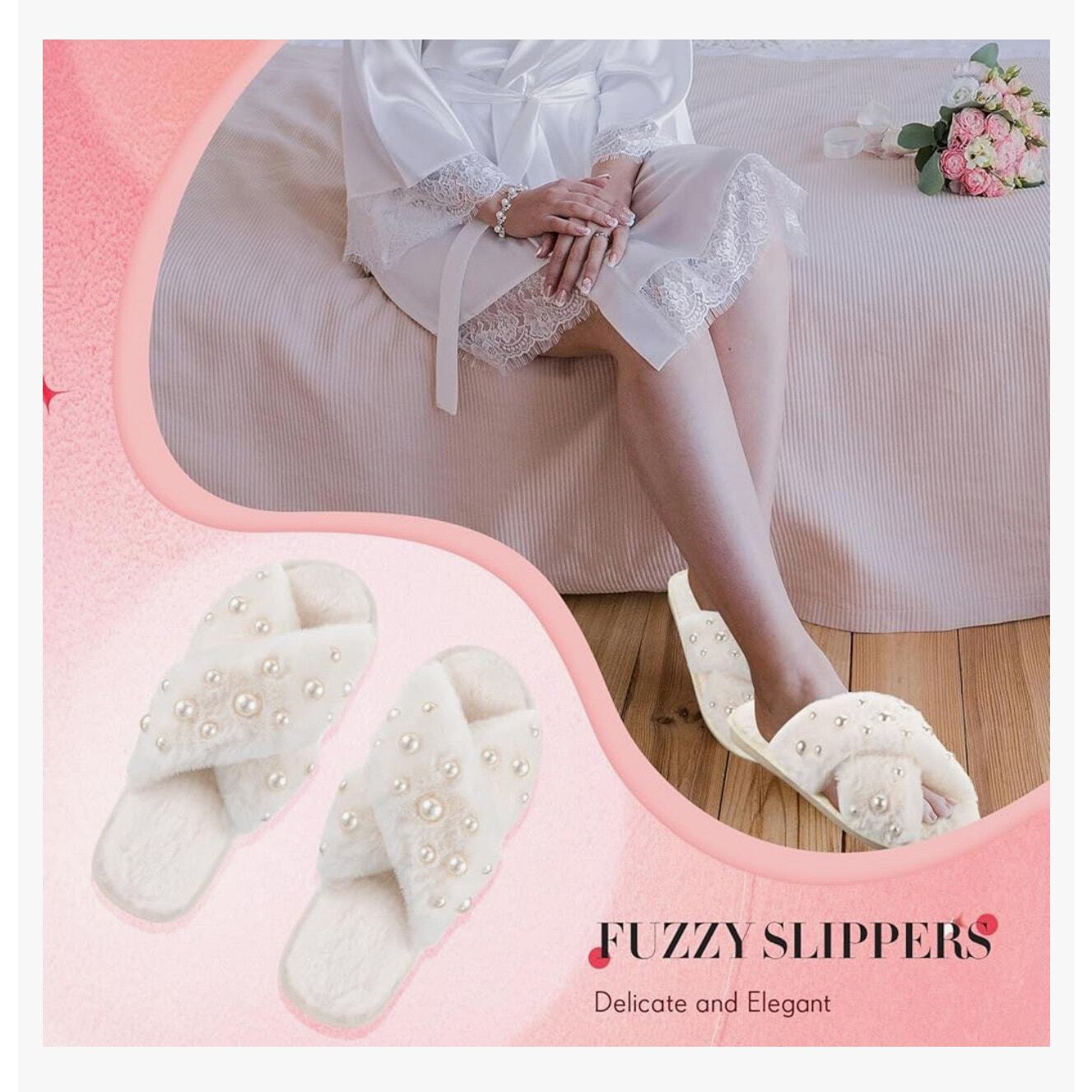 Bridal Bridesmaid Pearl Fuzzy Slippers 8.5