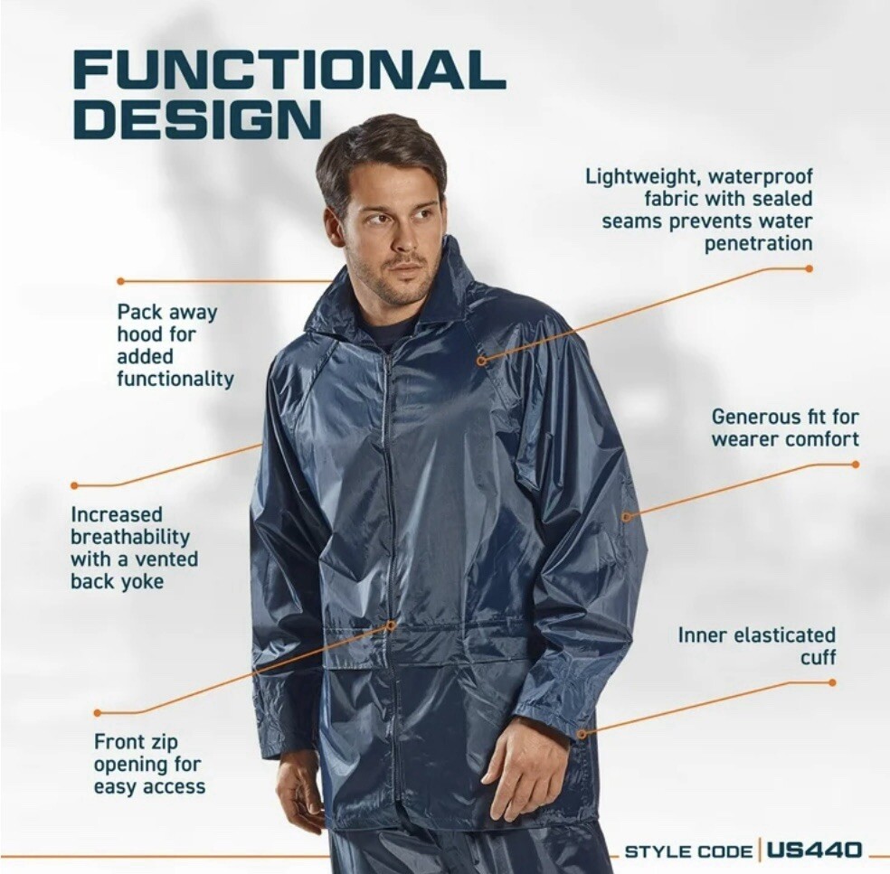 Portwest US440 Waterproof Rain Jacket Lightweight Coat Pack Away Hood Sz M
