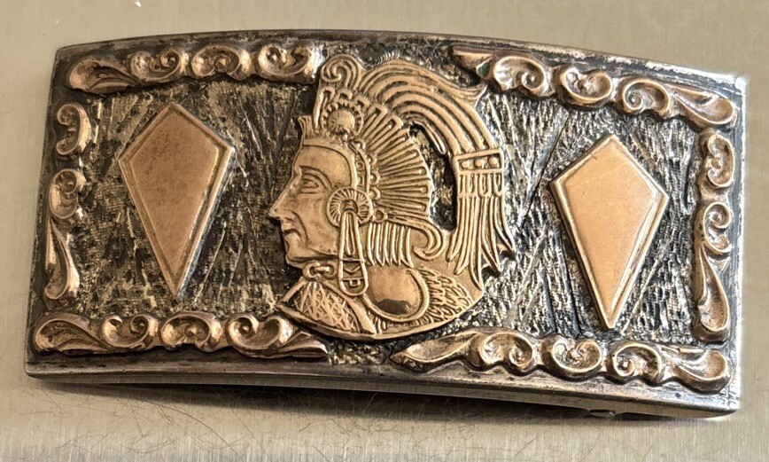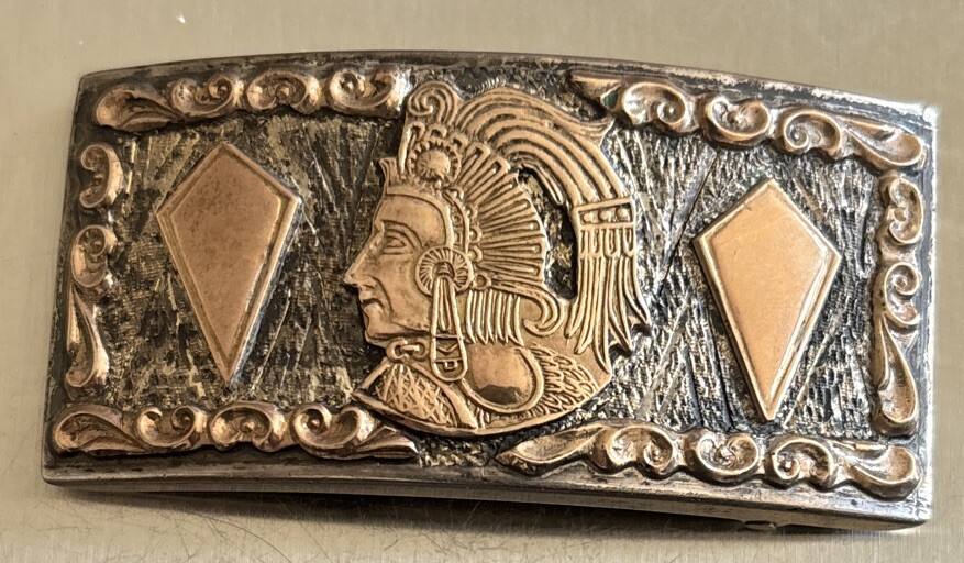 Rare Vintage Mexican Sterling Silver and gold Mayan Warrior Aztec Belt Buckle