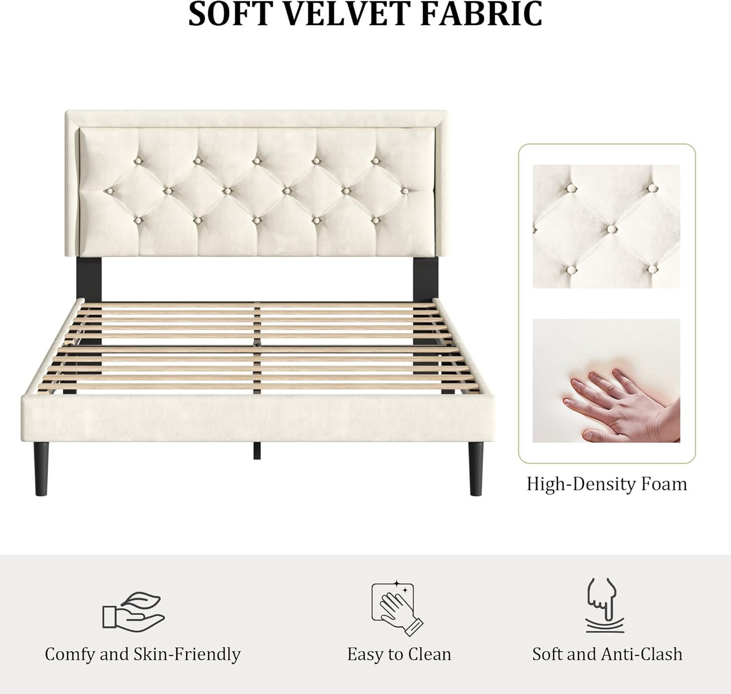 Full Size Platform Bed Frame with Upholstered Velvet Button Tufted Headboard, Ma