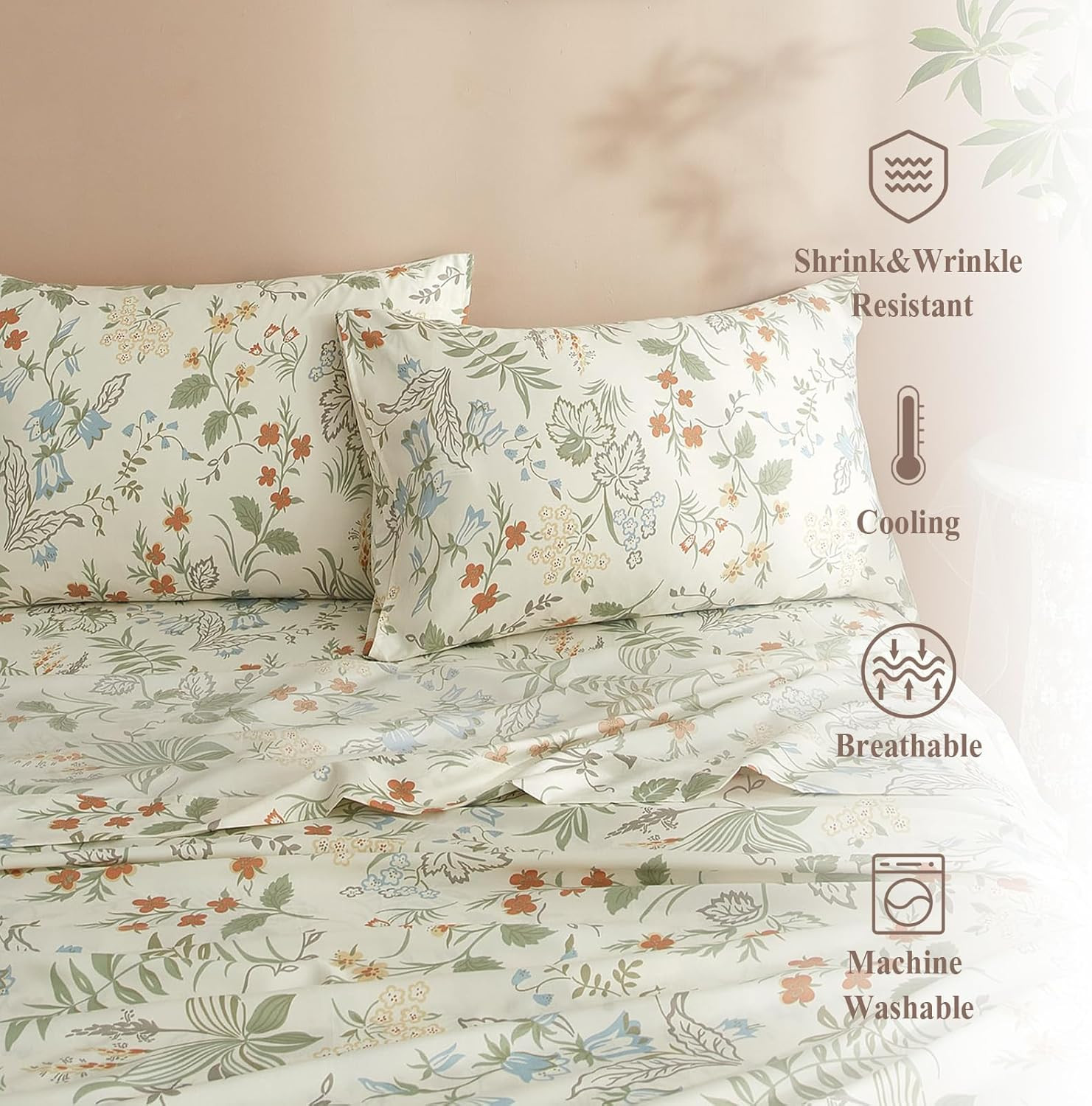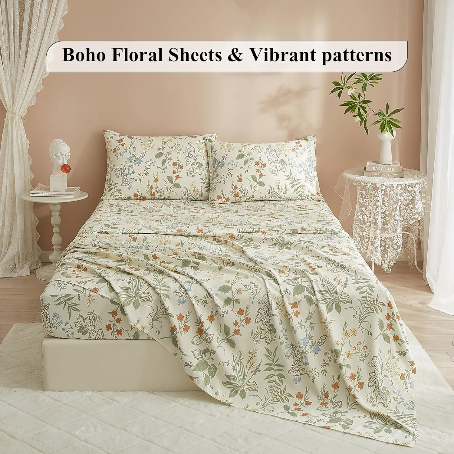Vintage Green Floral Full Bed Sheet Set, 4 Piece Cooling Comfy Design