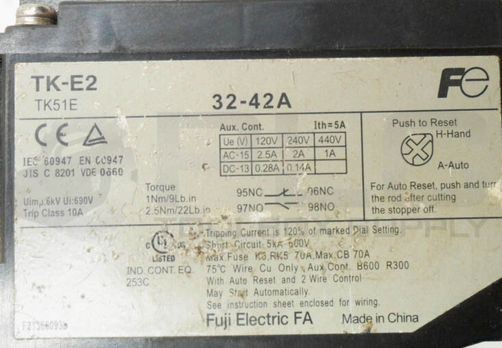 FUJI ELECTRIC TK-E2 THERMAL OVERLOAD RELAY 32-42A 440V