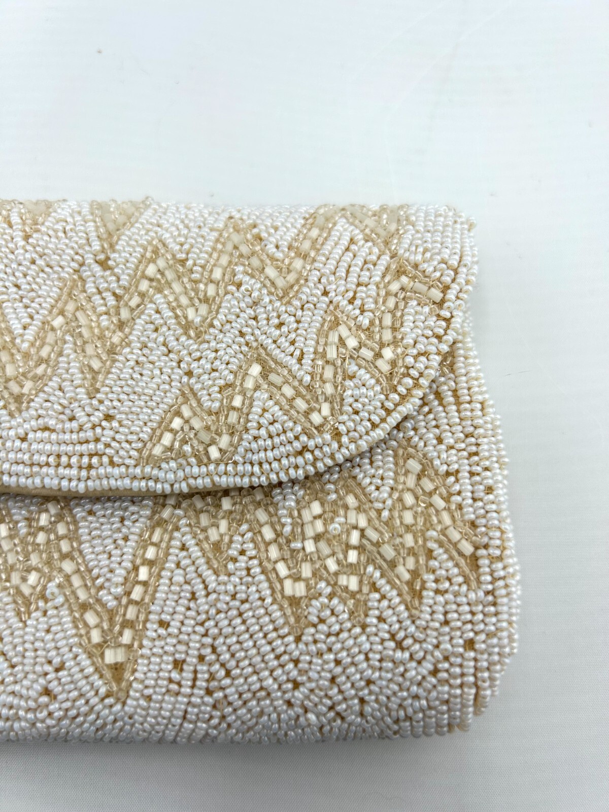 Vintage White and Cream Glass Beaded Evening Clutch Bag with a snap closure