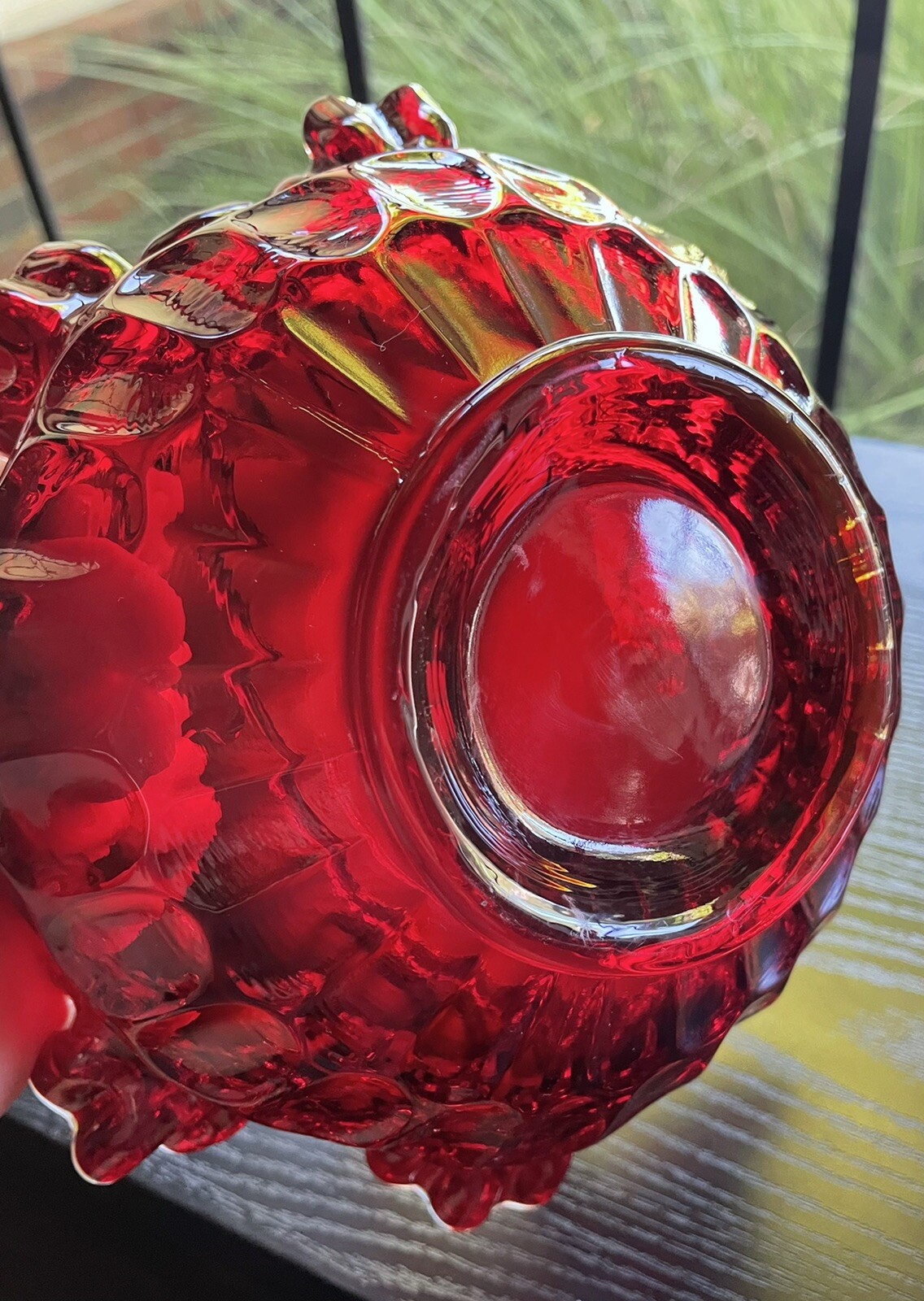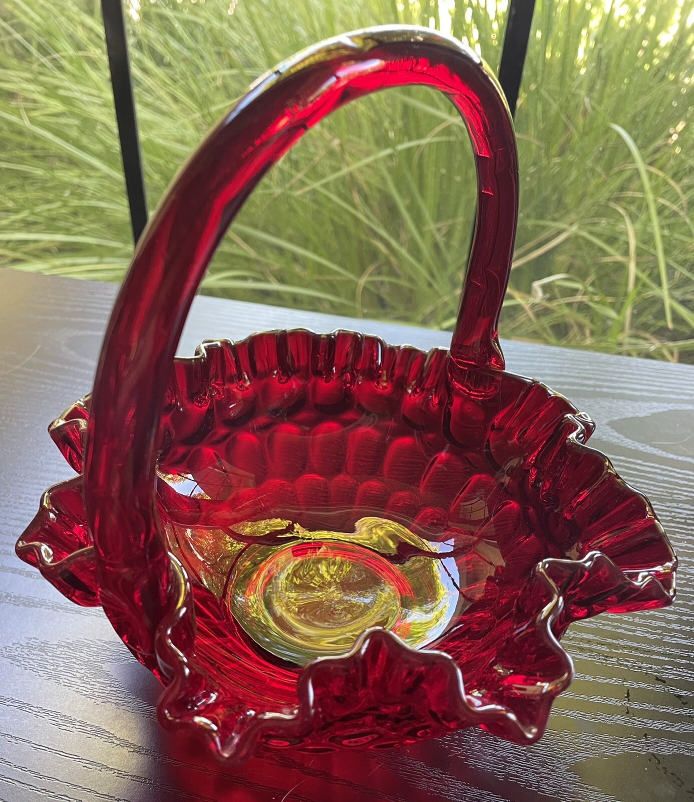 VINTAGE RED GLASS BASKET BOWL W/ HANDLE THUMBPRINT CRIMPED RUFFLED EDGE