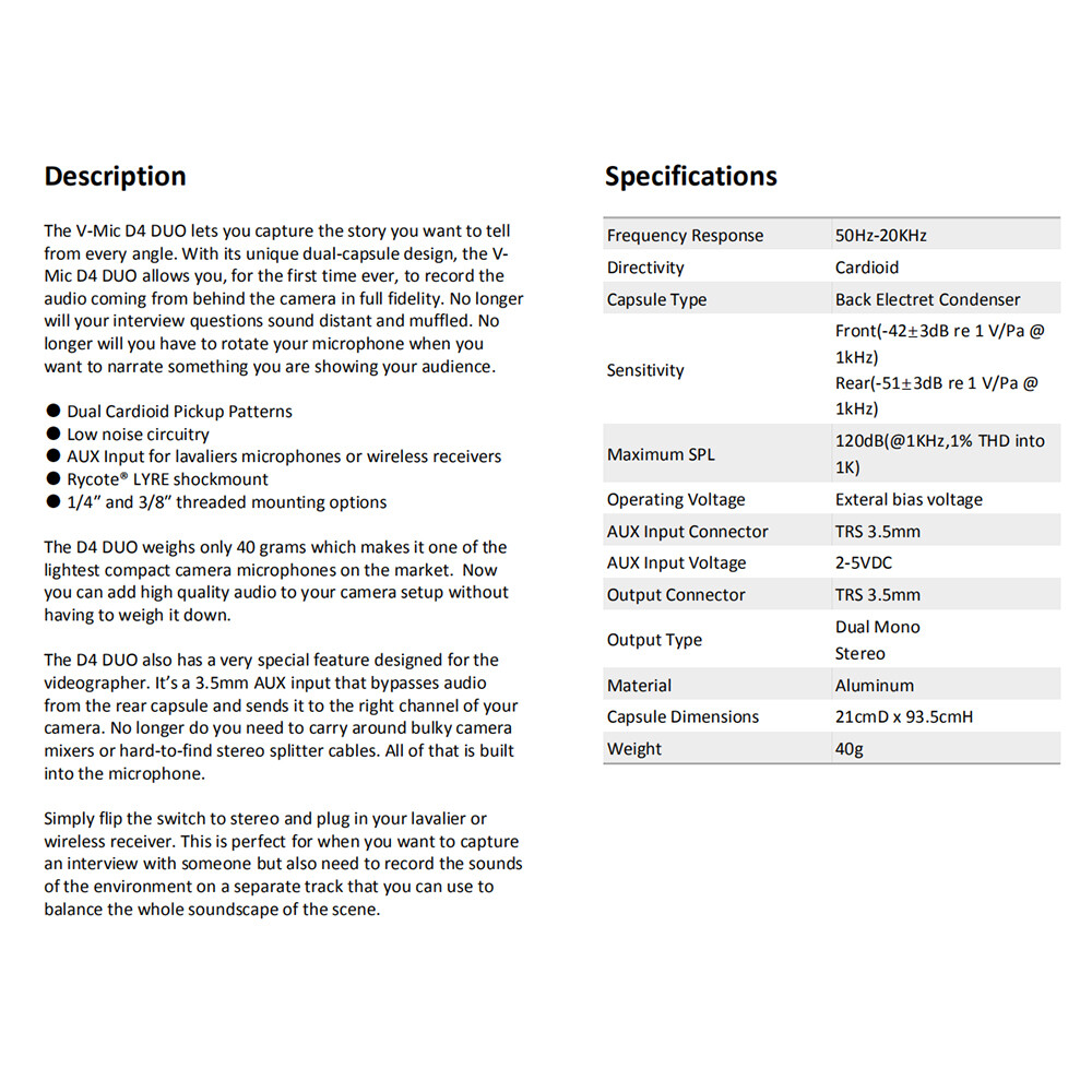 Deity V-Mic D4 Duo Dual-Capsule Microphone Portable Interview Mic for Phone DSLR