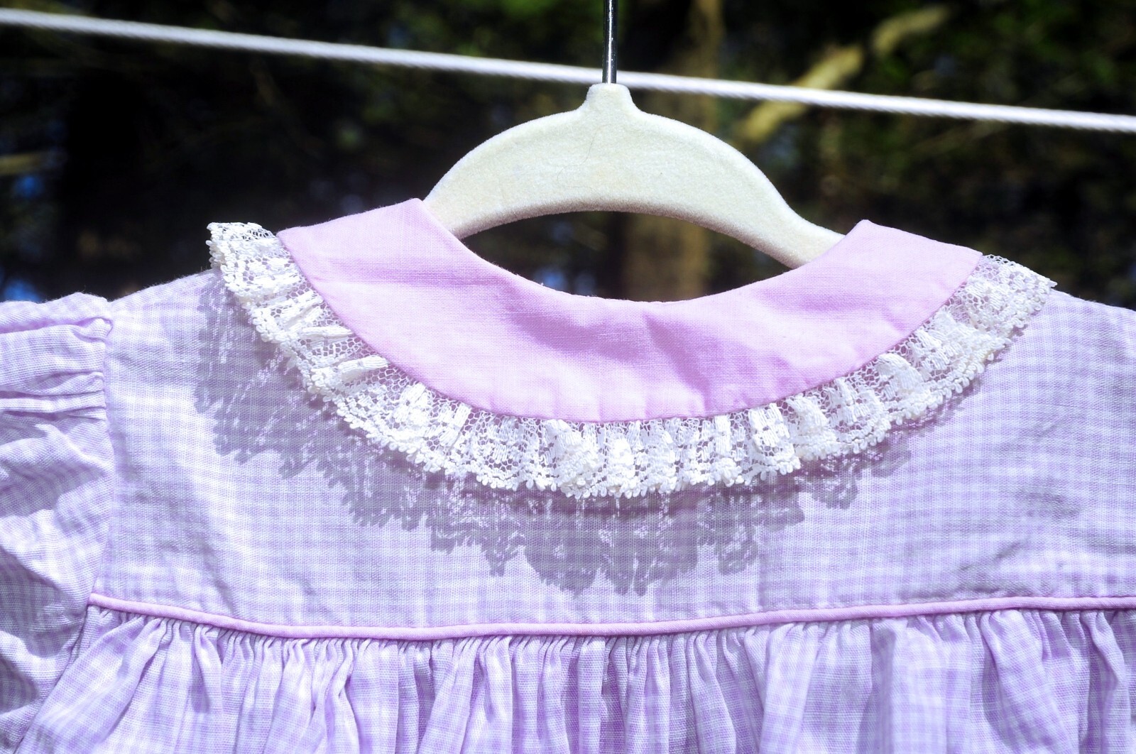как выглядит VTG 60s Toddler Girls Lavender Gingham Check Party Dress Cotton w/ Lace 2T-3 фото