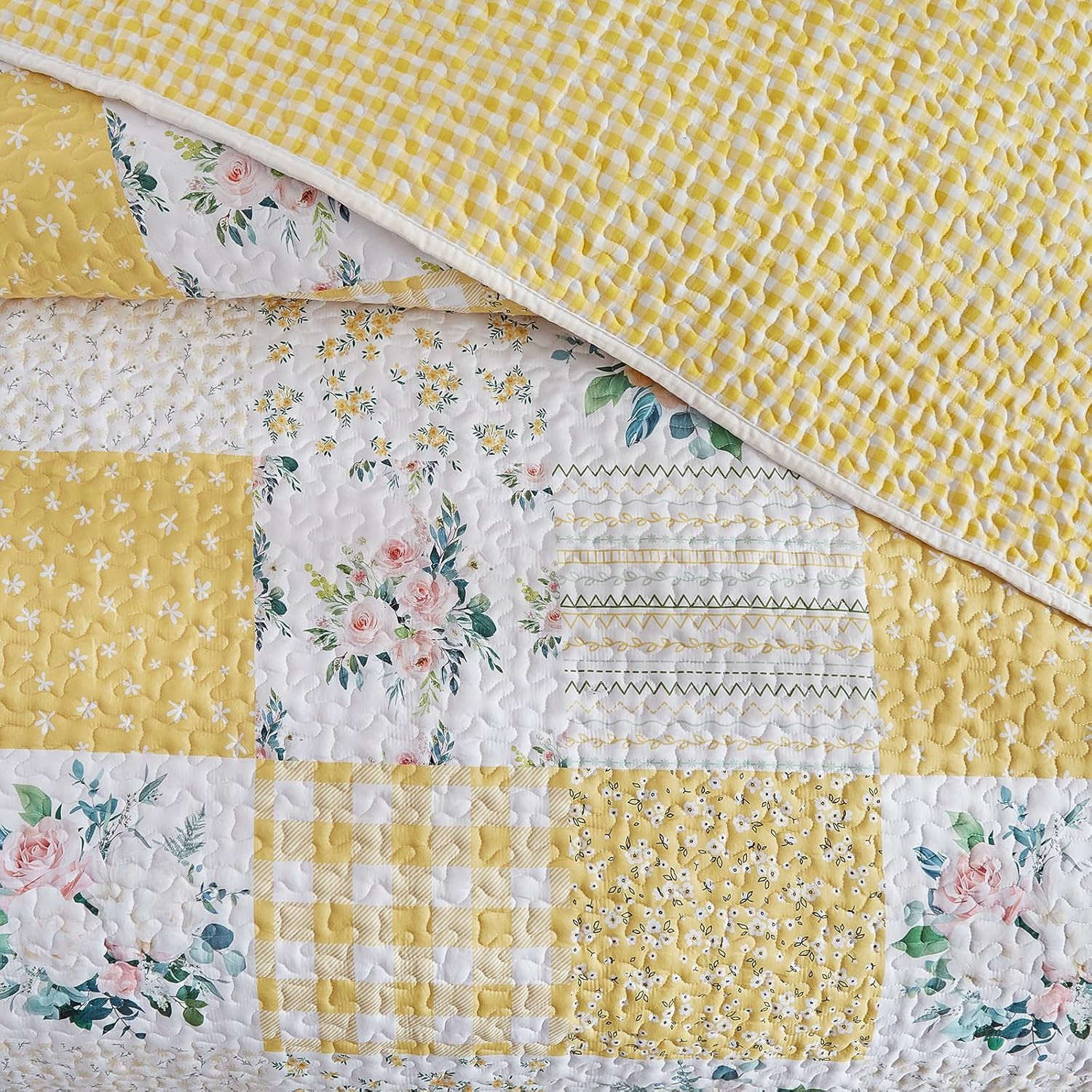 как выглядит 3 Pieces Patchwork Quilt Set California King, 102X114 Inches- Yellow N White Flo фото