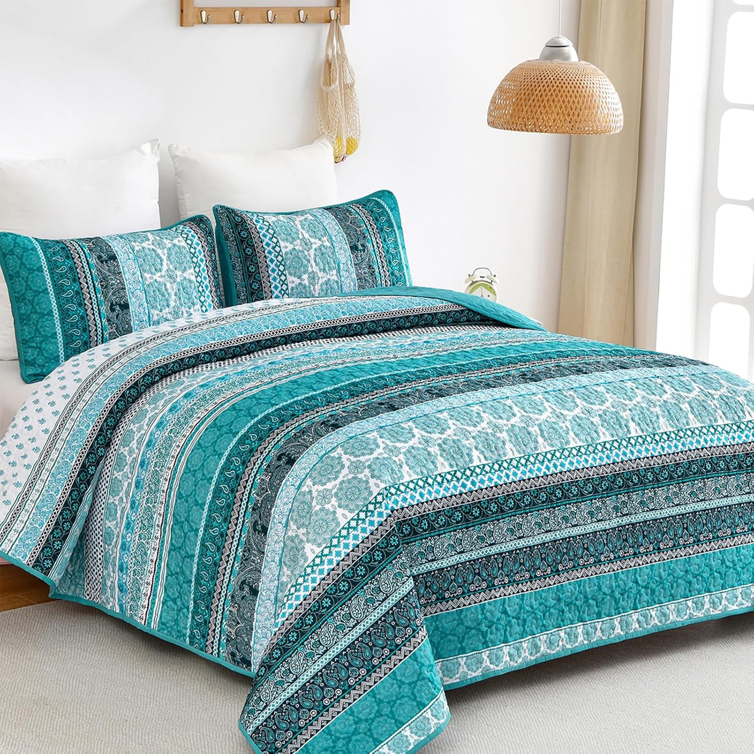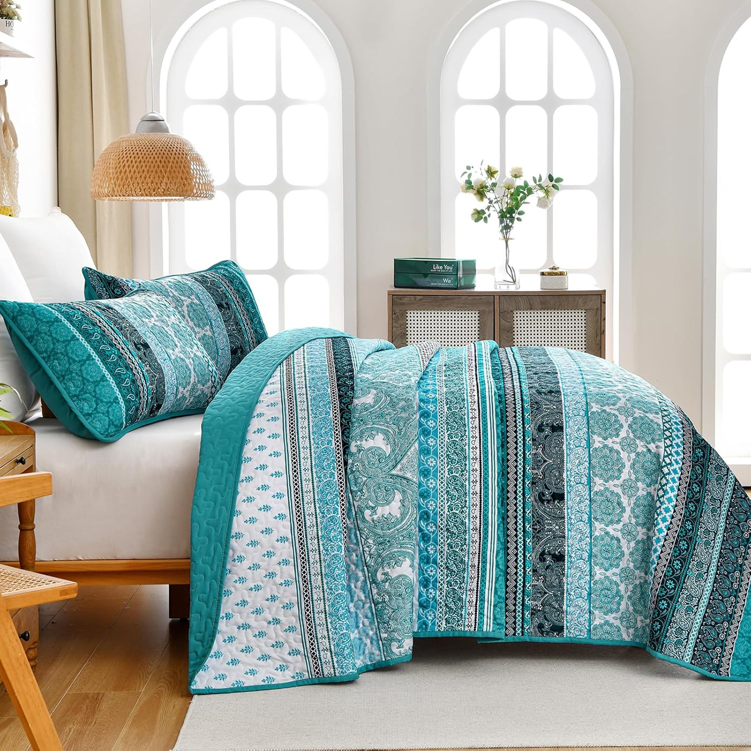 Boho Quilt Set Queen Size, Teal 3 Pieces Bohemian Striped Patchwork Bedspread Co