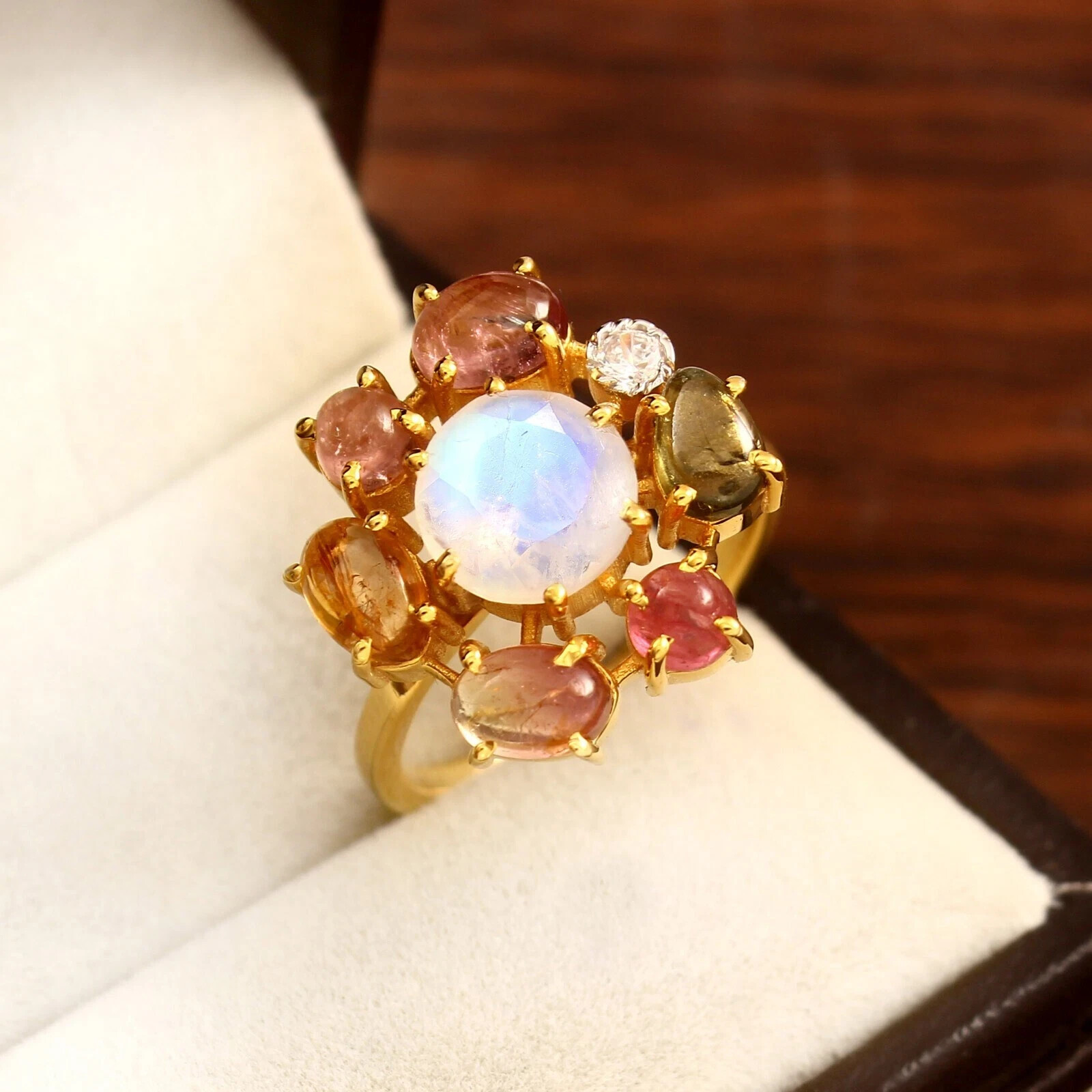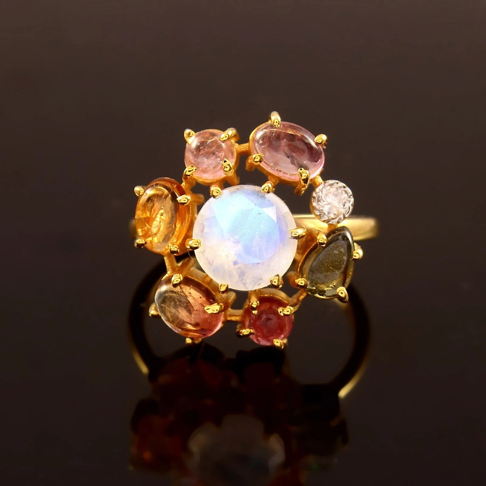 Natural Moonstone Multi Tourmaline 925 Sterling Silver Gold Plated Ring