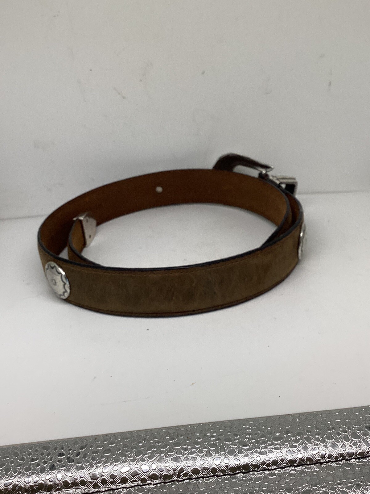 как выглядит Vtg Western Concho USA 29-33 Womens Smooth Leather Western Belt Brown NEW фото