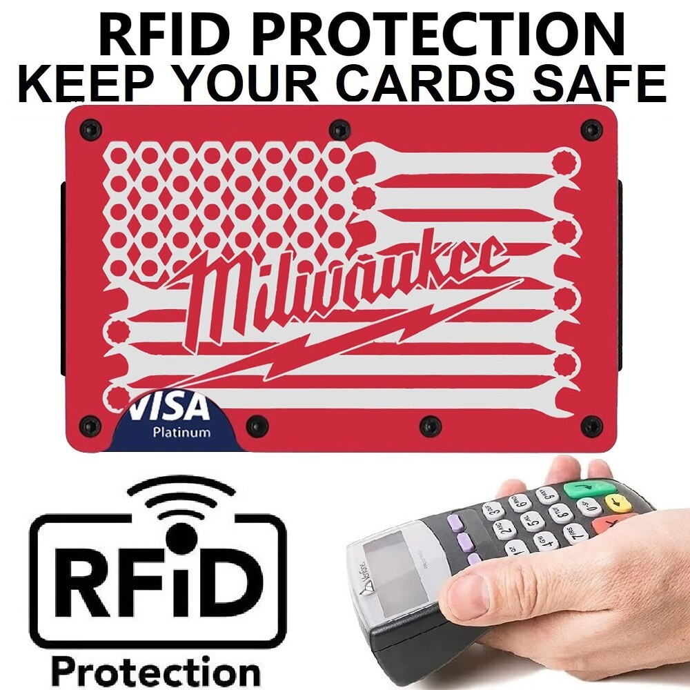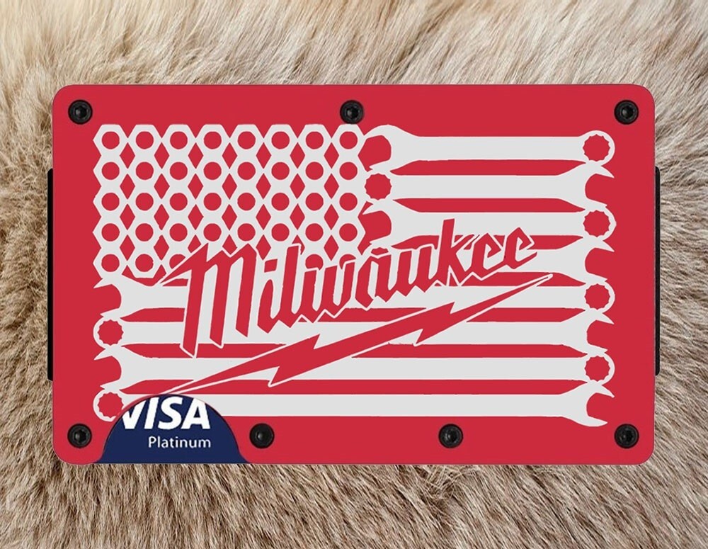 Custom Milwaukee Tool Flag Engraved Titanium Carbon Red RFID Blocking Wallet D7