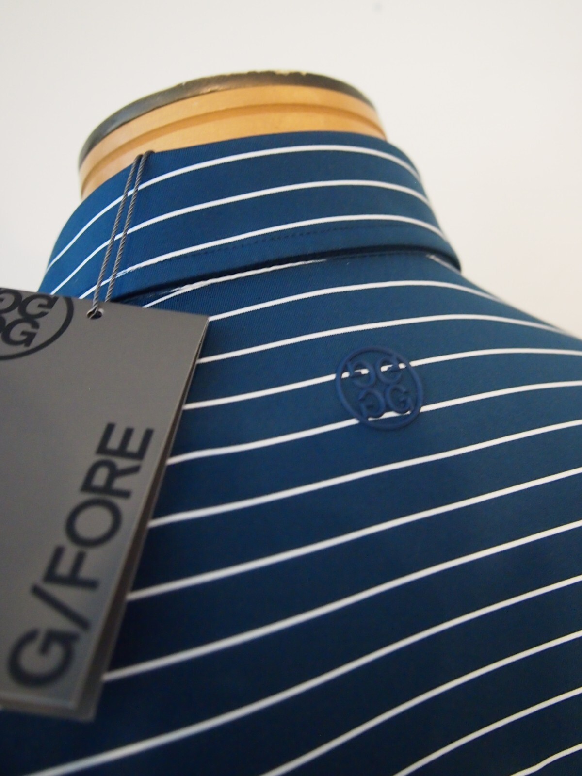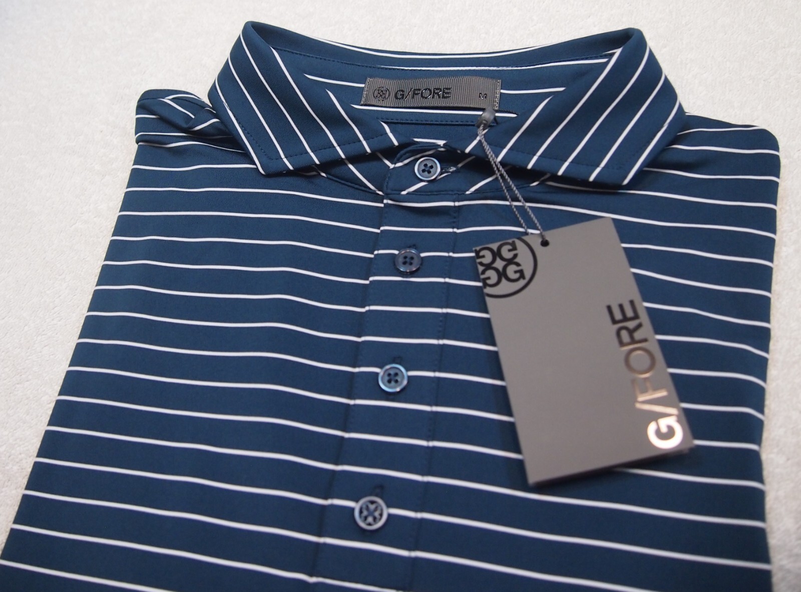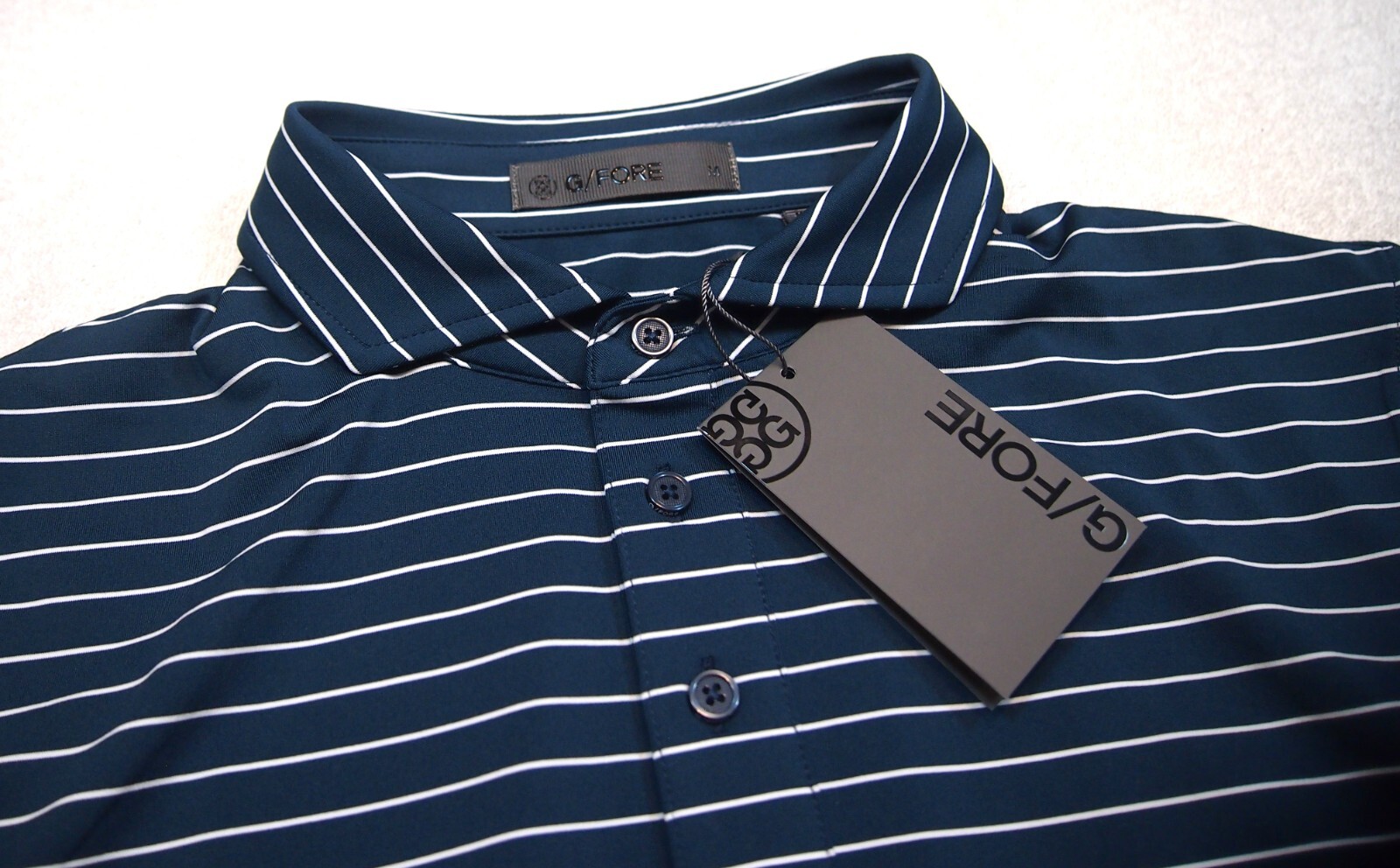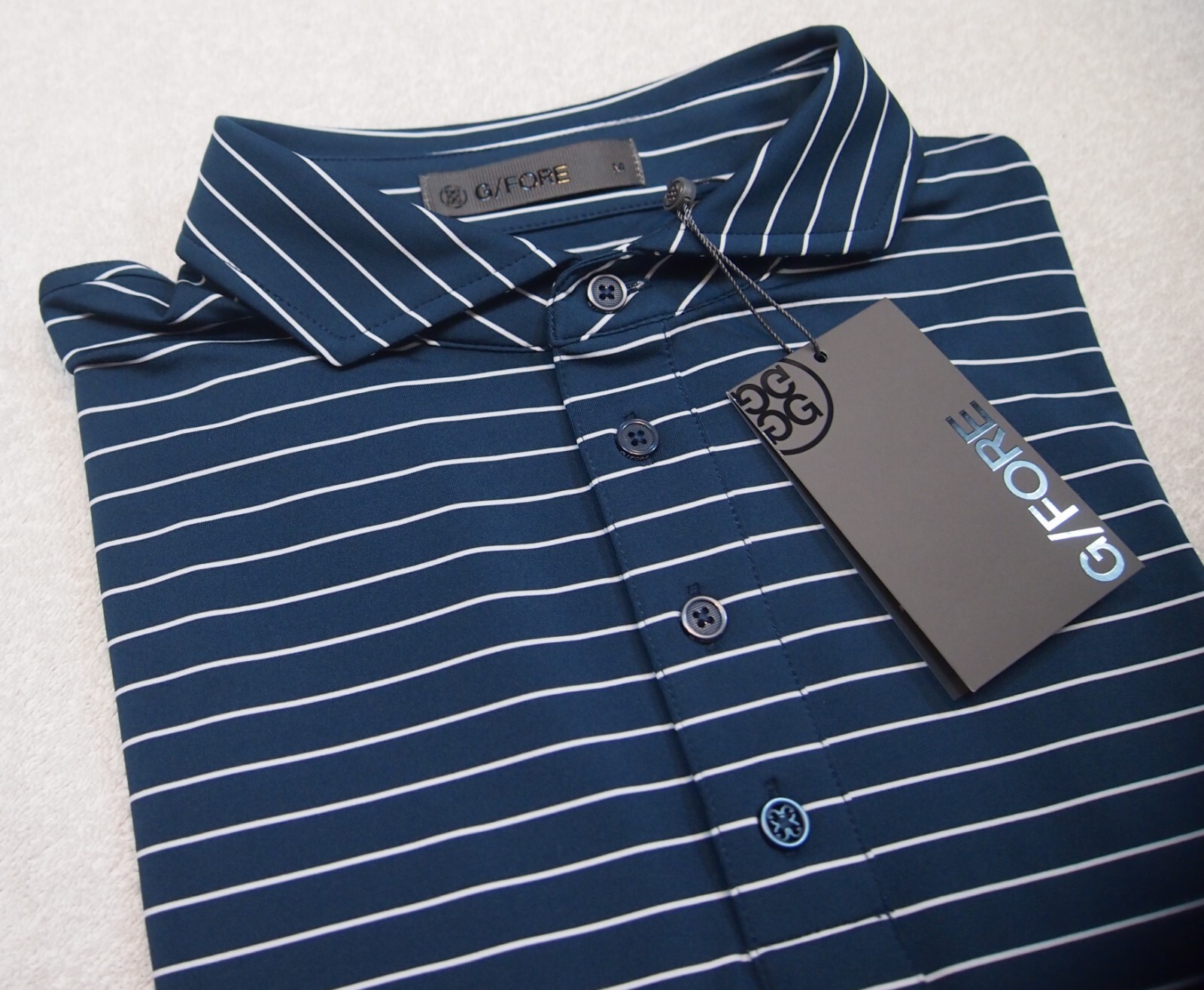 как выглядит G/FORE Performance Fabric Navy Blue Stripe Slim Fit Polo Shirt NWT M 120 фото