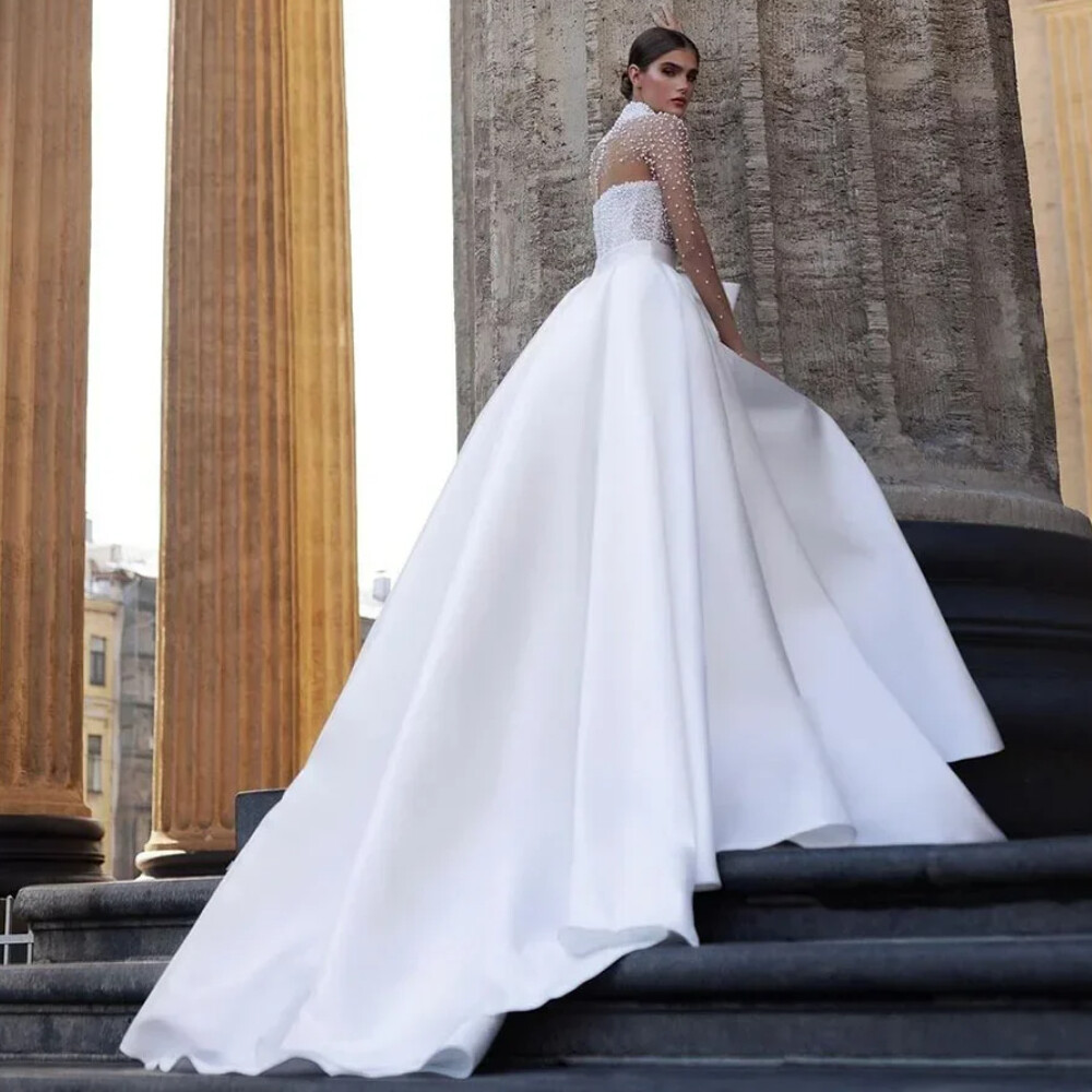 Luxury Satin Wedding Dresses Detachable Train Beaded Pearls Bow Bridal Gowns