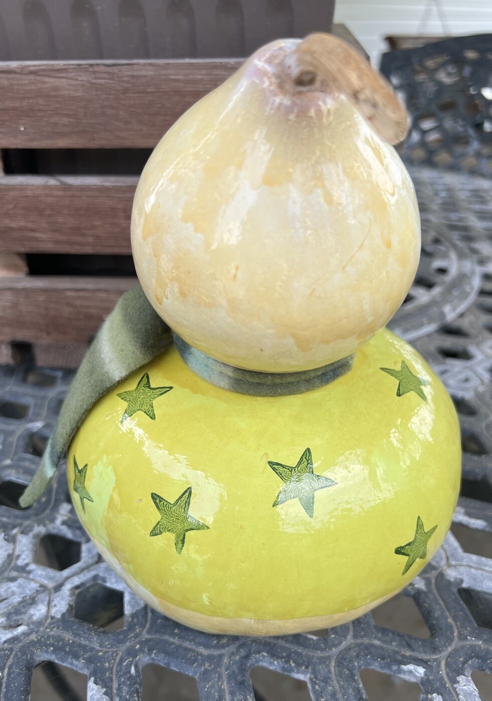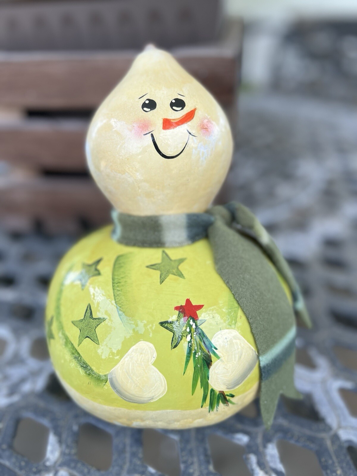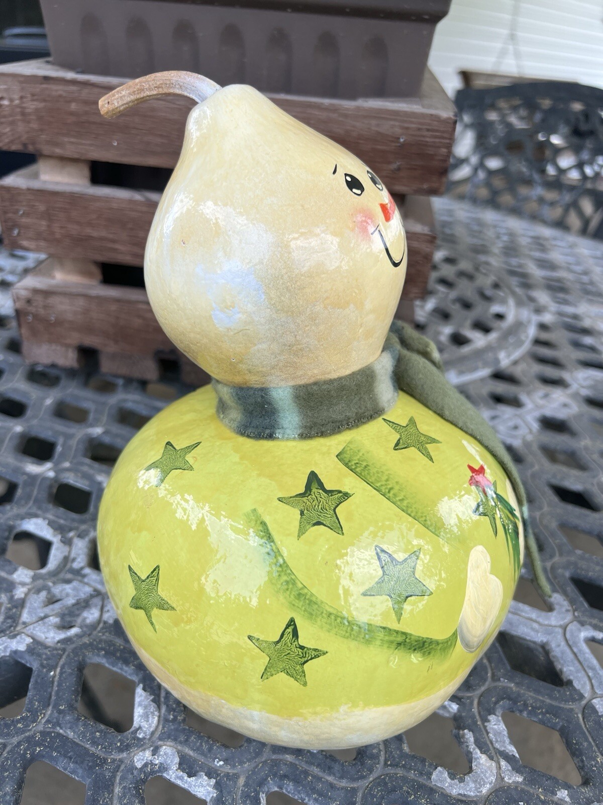 • Hand Painted Gourd Snowman Holiday Figurine w/ Scarf Hand Crafted Glossy Signed