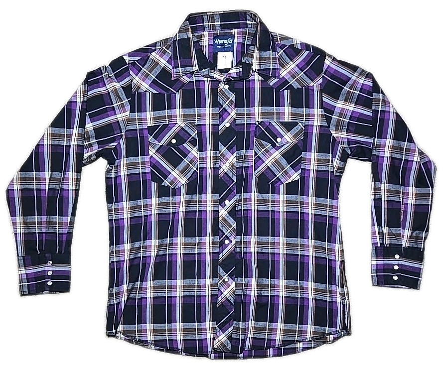 как выглядит Vintage 90s Wrangler Western Shirt Mens Pearl Snap Purple Plaid Size Large фото