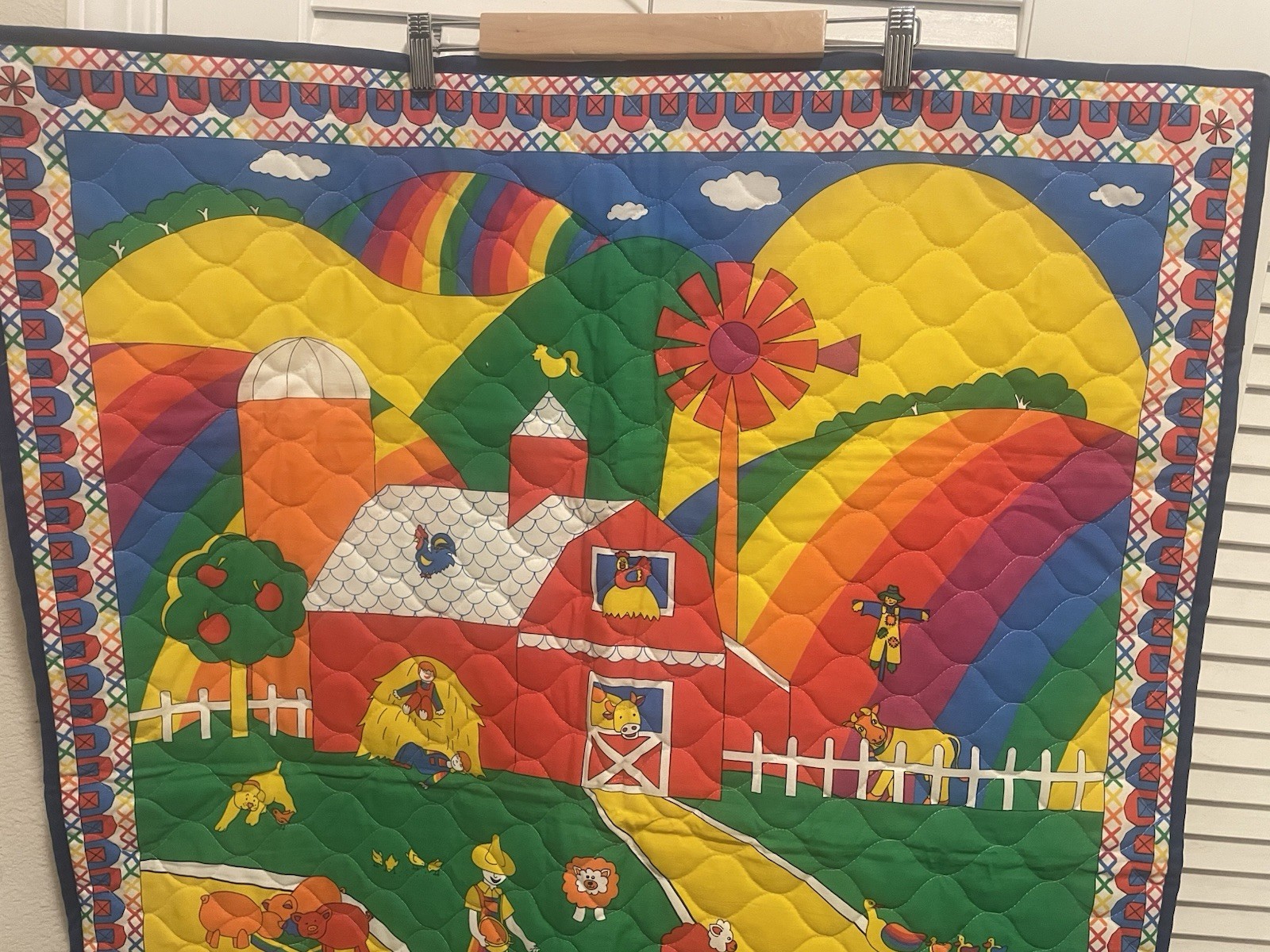 Vtg Rainbow Farm Crib Quilt Wall Hanging Baby Nursery Blanket Polka Dots