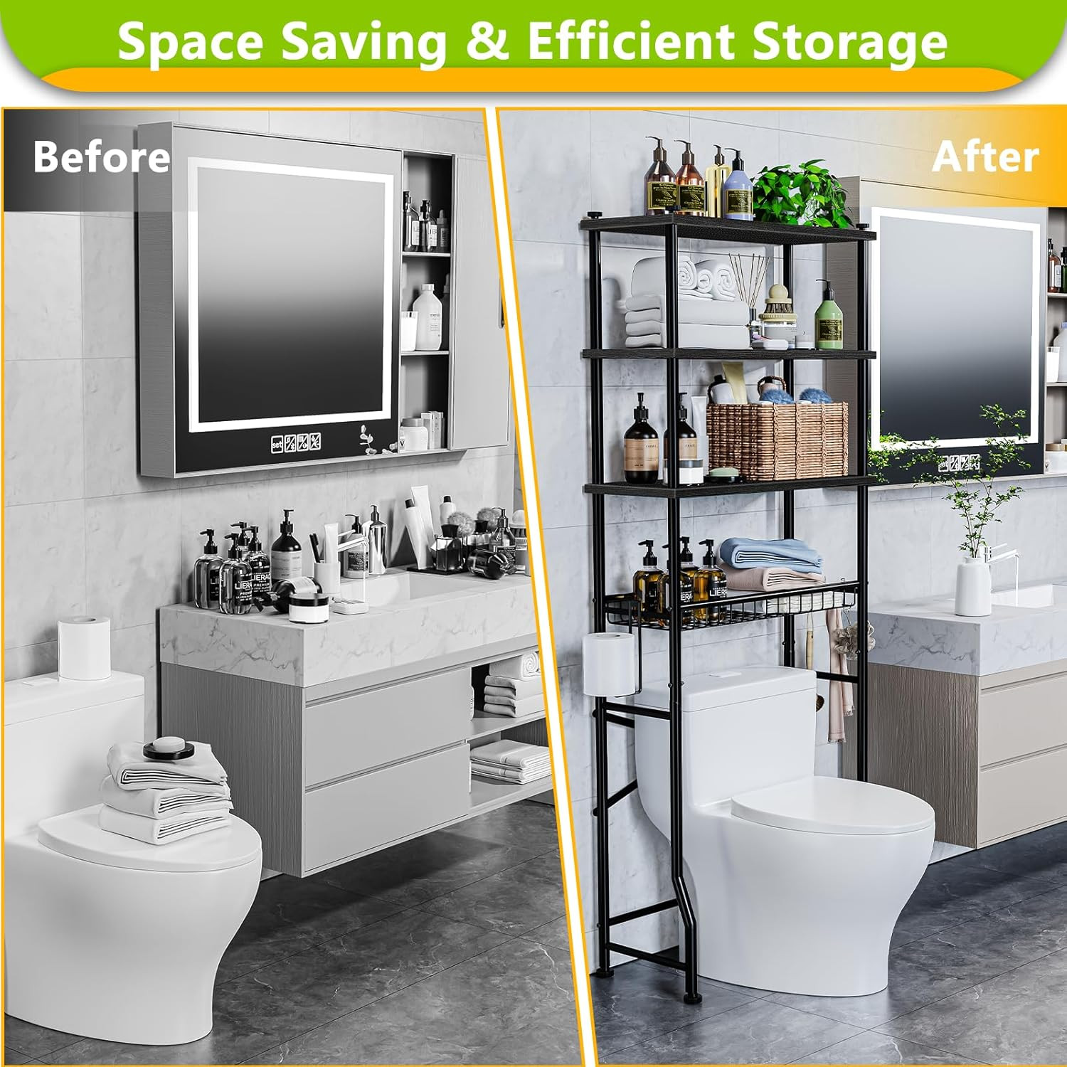 4-Tier Over-The-Toilet Storage Rack with Adjustable Shelves Basket - Black