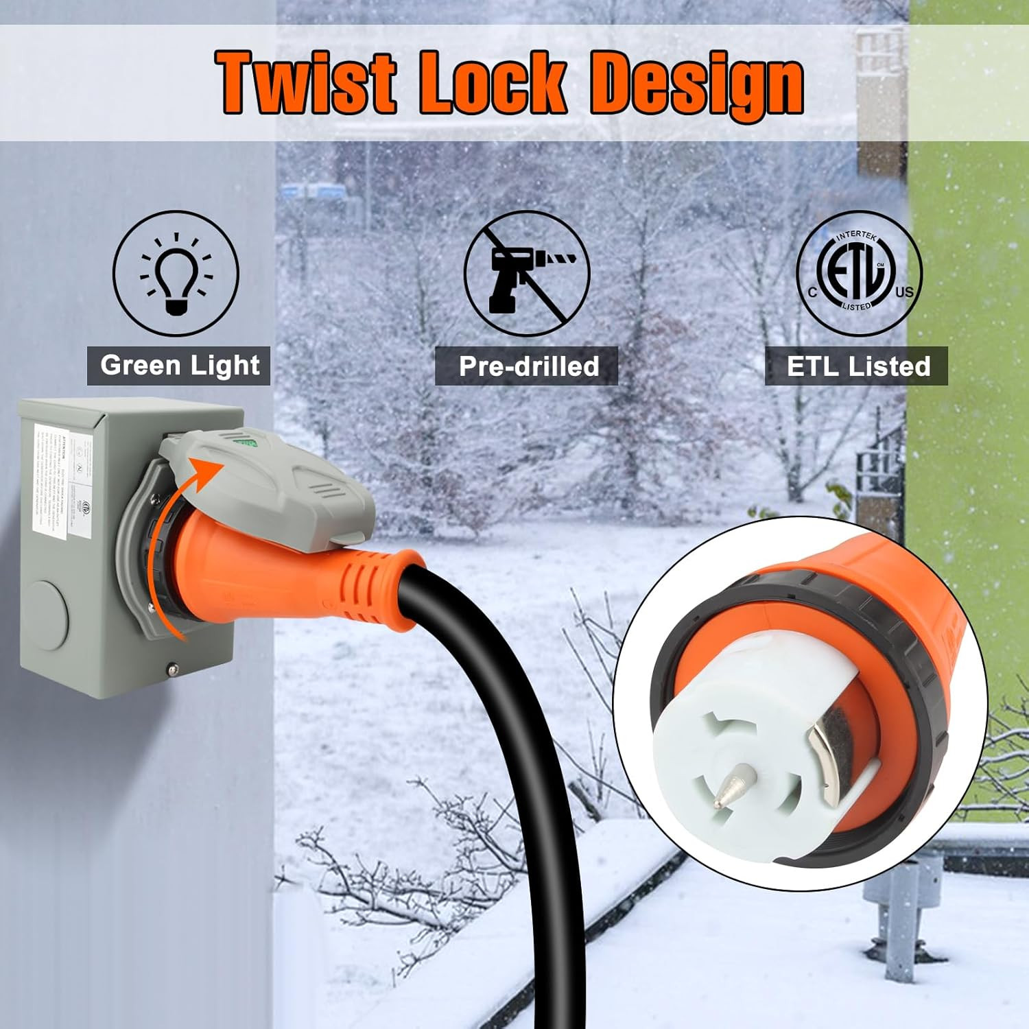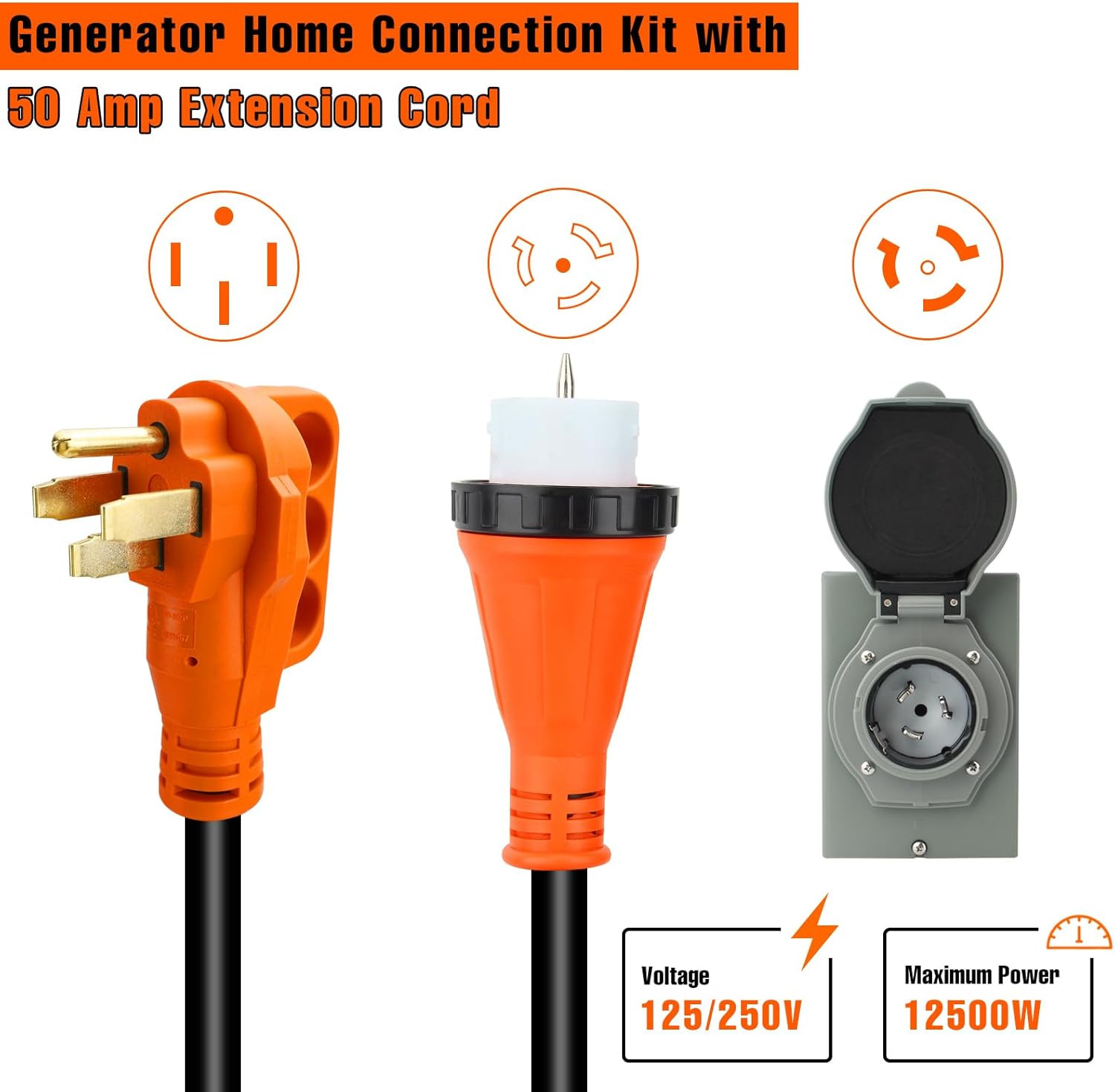 • 50 Amp Generator Cord 25FT and 50 Amp Power Inlet Box for Home, NEMA 14-50P SS2-